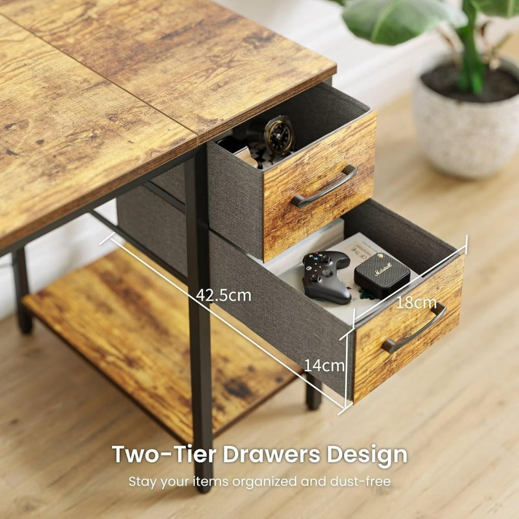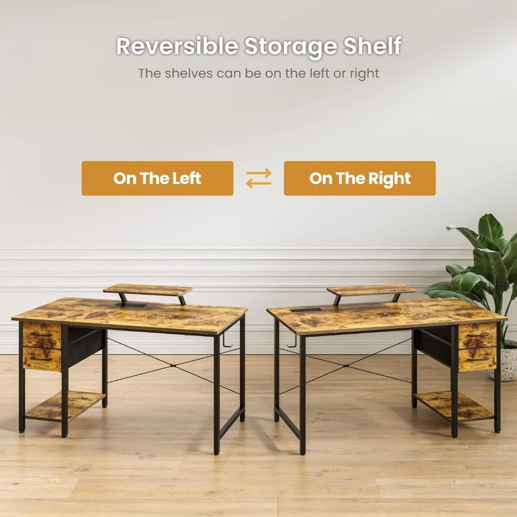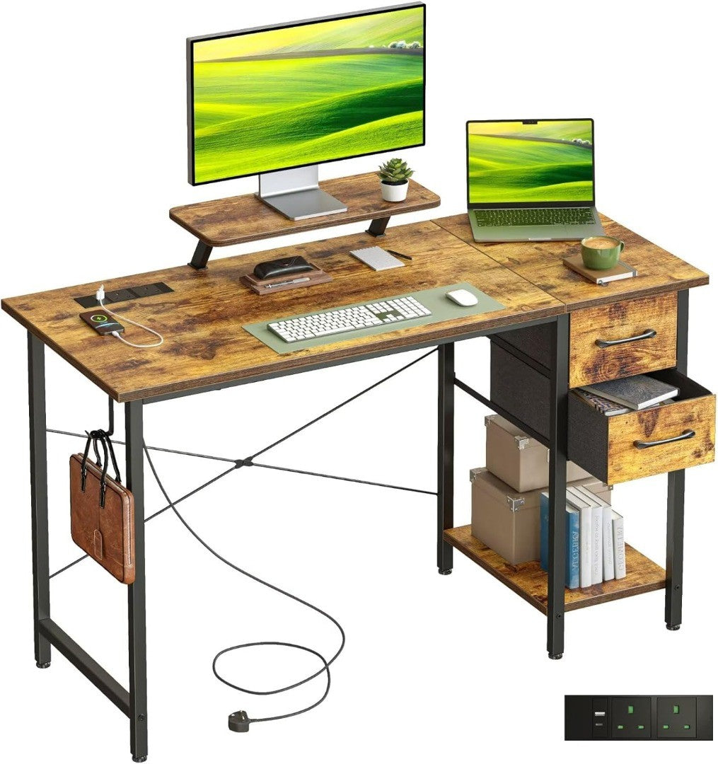 DOMSHOCT Computer Desk with Drawers & Power Outlets, 100*50cm Home Office Desk with Monitor Stand, Gaming Table with Reversible Storage Shelf & Hook, Small PC Workstation for Study Work Write, Brown