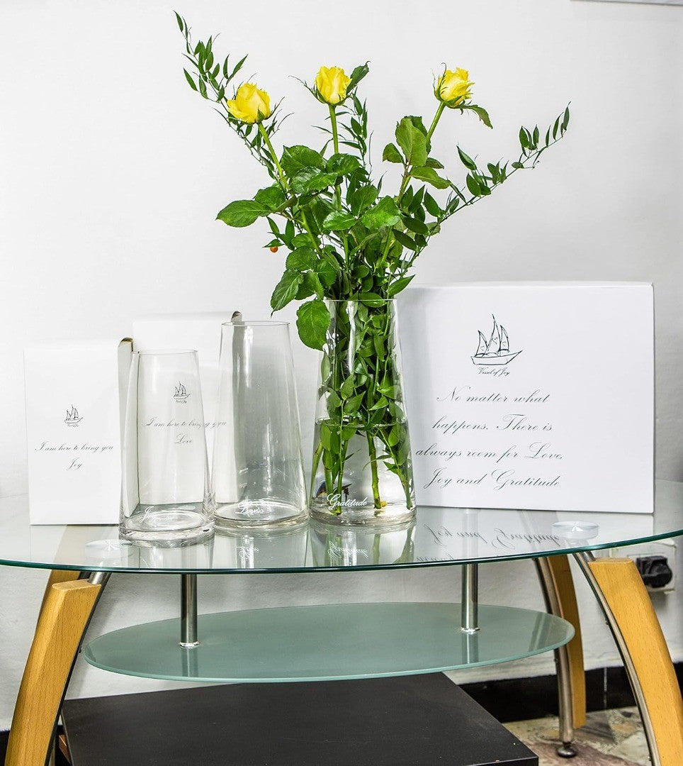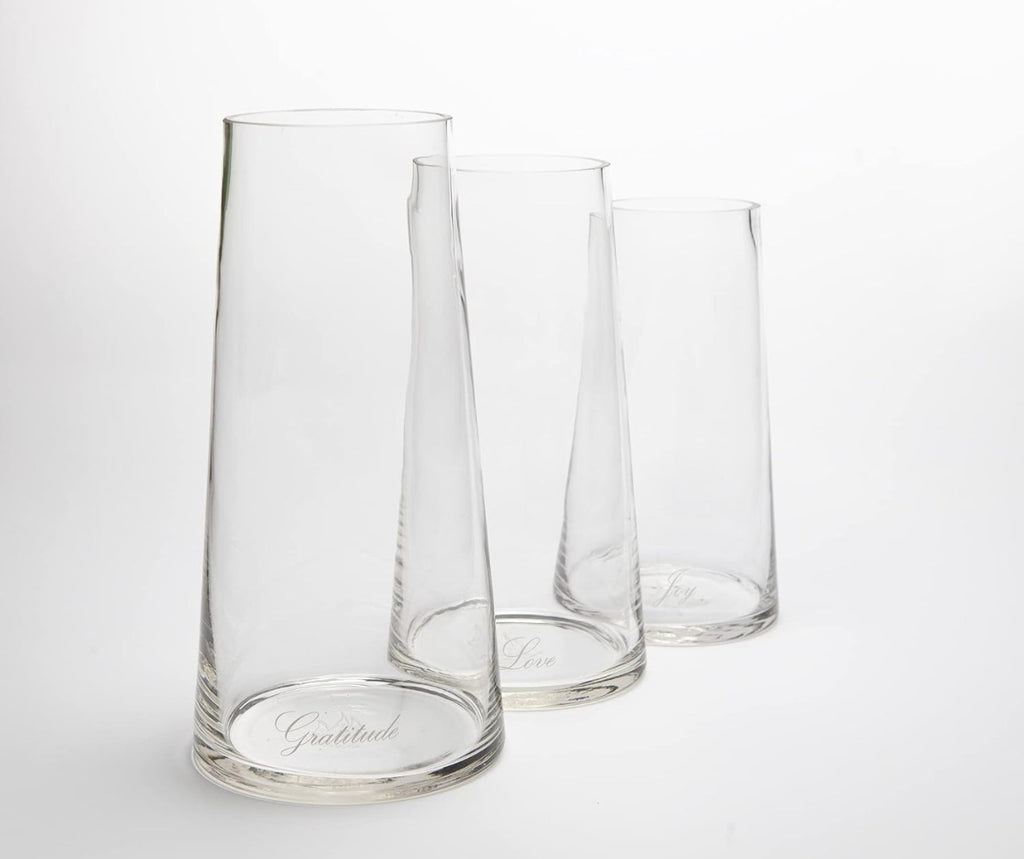 Vessel of Joy Set of 3 Tall Glass Vases: Love, Joy & Gratitude Transparent Handmade Gift Set Clear