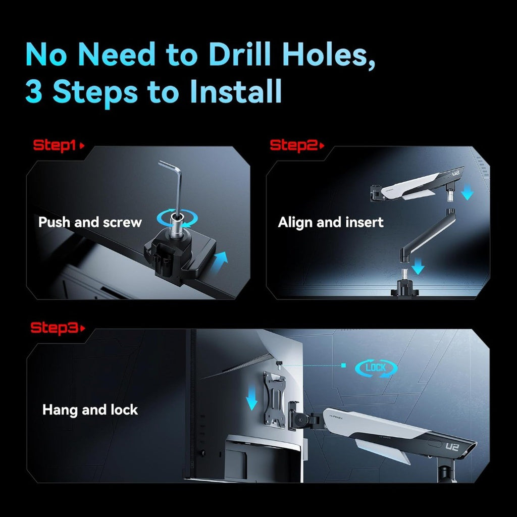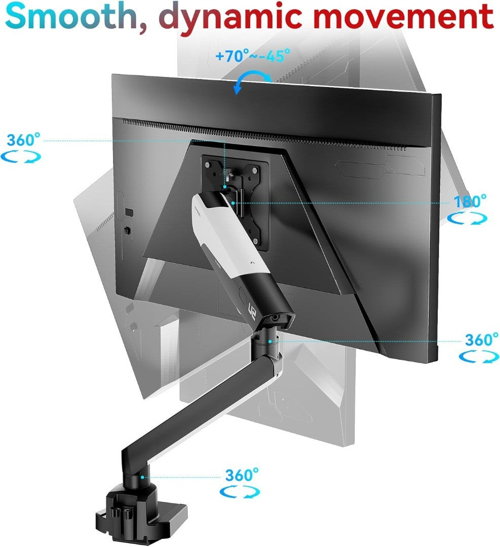 Universal Adjustable Monitor mount – The monitor arm with Mechanical Spring offers a five-axis universal adjustment system, allowing full 360° rotation and precise positioning to ensure optimal viewing angles, whether you're gaming, working, or streaming.