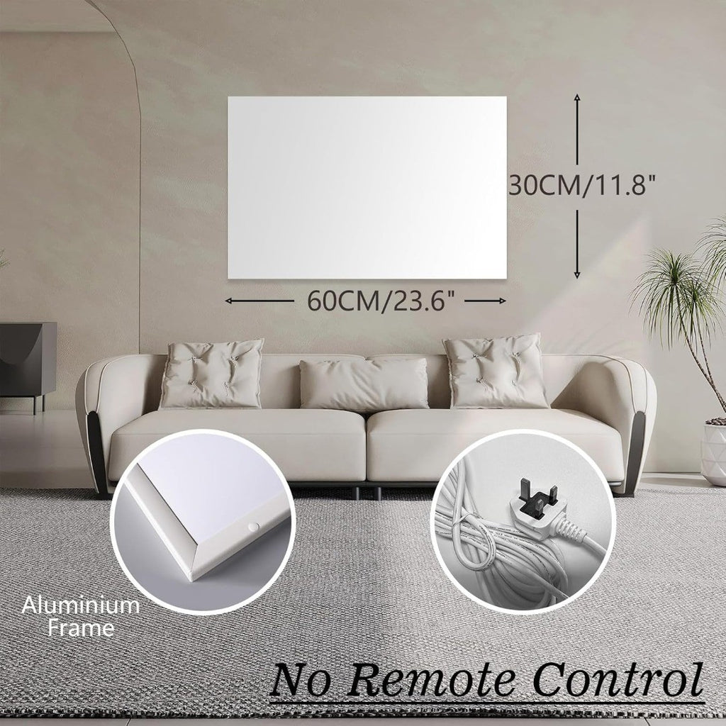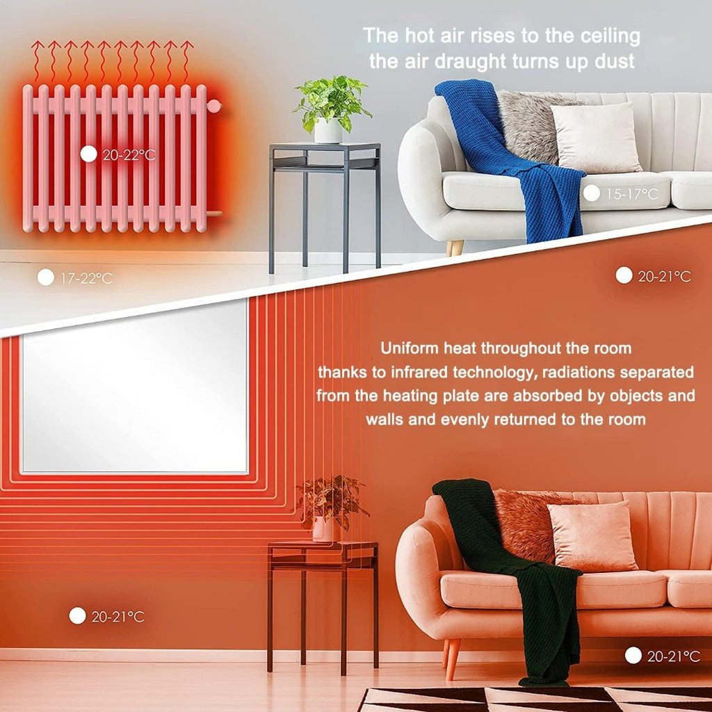 - Energy Efficient - Infrared flat heater are a healthy form of heating, because the radiant heat creates no air circulation. Also fitted with quick heat up and slow cool down metal heating element. Make heating efficient and energy saving.