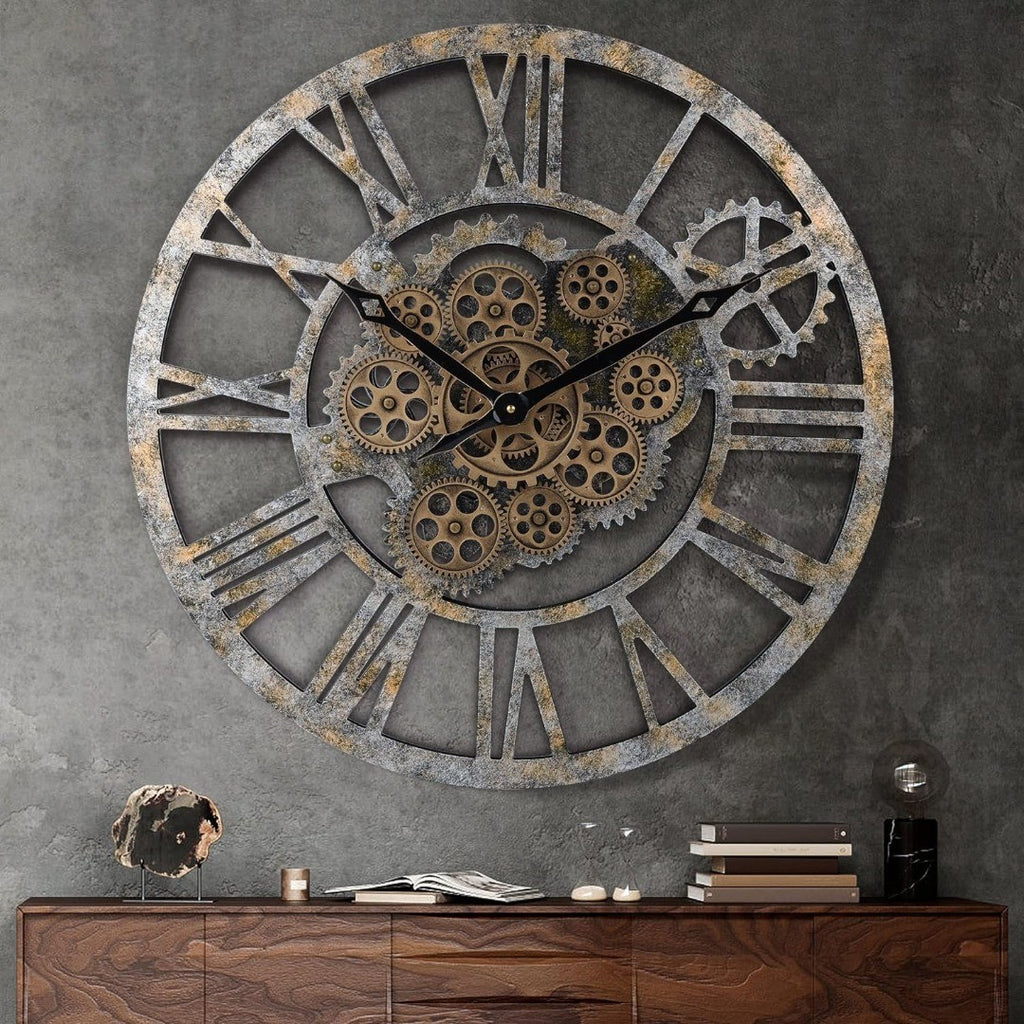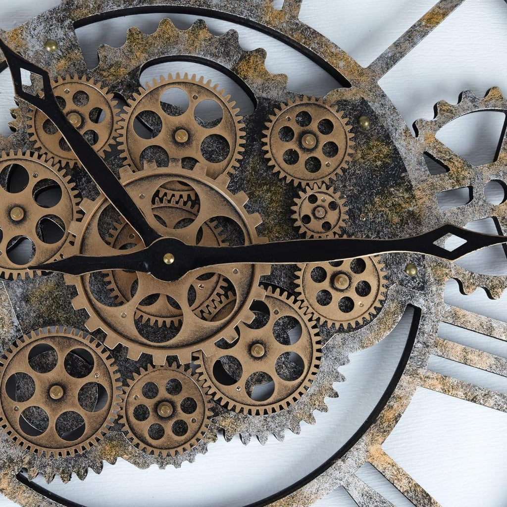 Farmhouse & Rustic: Add a touch of vintage flair to your home decor with this distressed bronze wall clock. The artificial rust-imitated treatment marks on the MDF dial, black metal clock hands and gold moving gears provide a steampunk industrial appearance. Very stylish and unique, easily to attract other's attention.