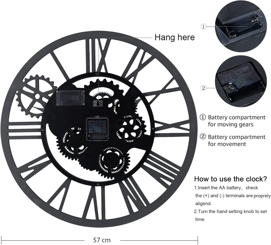 Battery Operated: The clock hands and the gears are operated by two separate battery compartments, 2 AA batteries for the moving gears, 1 AA battery for the clock hands, they can run simultaneously or independently (Note: Battery is not provided.)