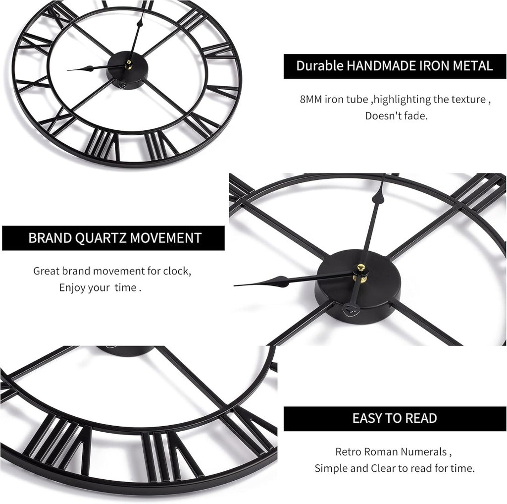Large Metal Wall Clock Roman Numerals Silent 60cm Black