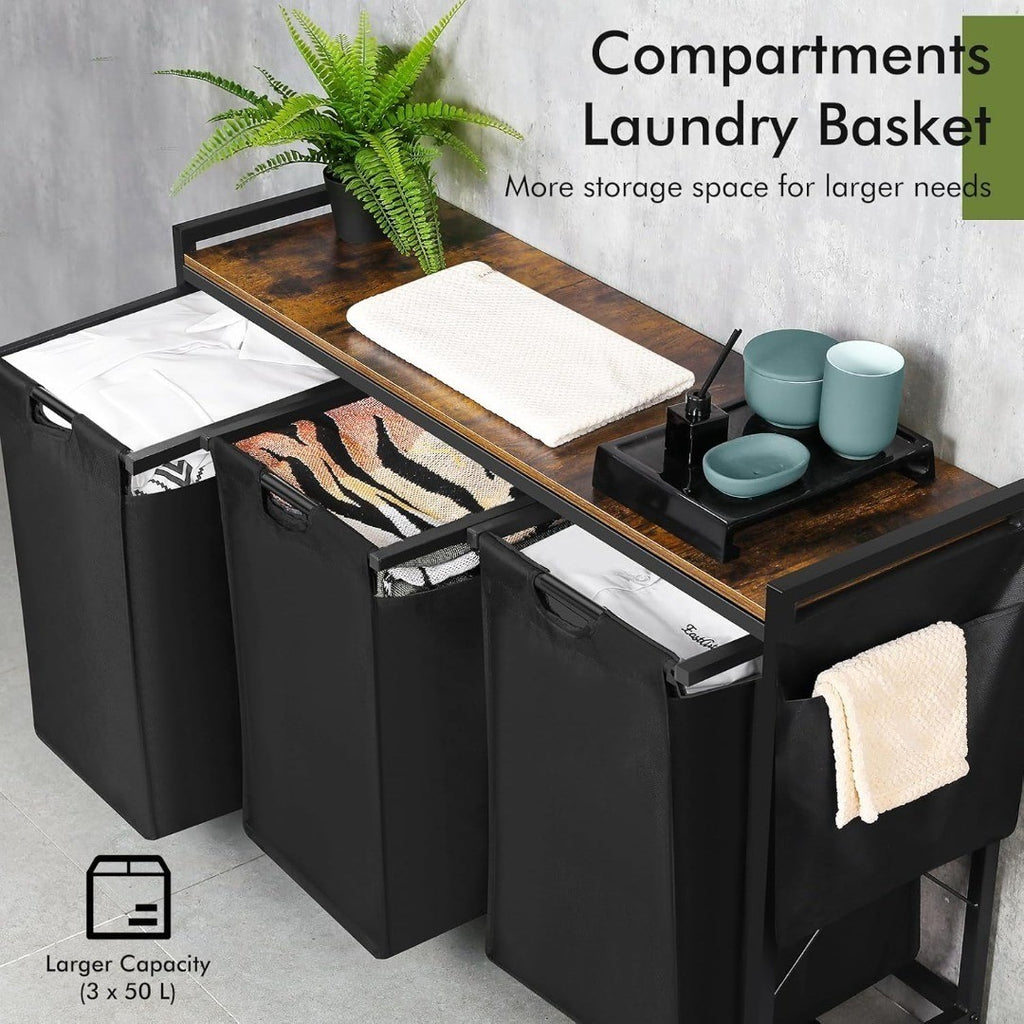 Laundry Basket 3 Compartments, Laundry Hamper with Shelf, Total Capacity 3 x 50 L, Removable Oxford Fabric Laundry Bag, Washing Basket with Side Pockets and X-shaped Holder.