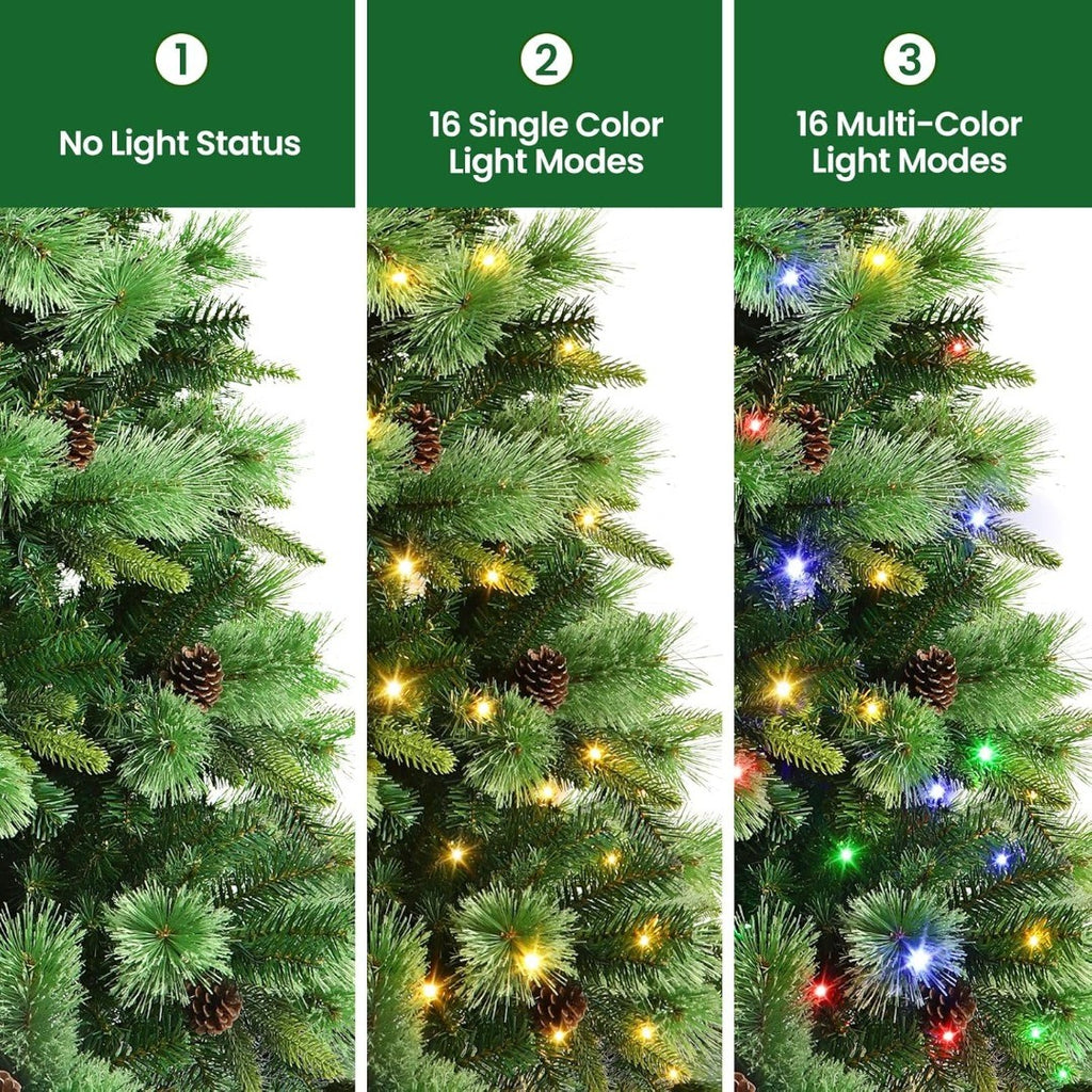 Pre-Lit Design - Pre-installed 340 multi coloured lights with 12 Lights Modes: Warm White Steady on, Multi-colour Steady on, Warm White Twinkle/Flash, Multi-colour Twinkle/Flash, Warm White/Multi-colour Alternating, Warm White Breathing, Multi-colour Breathing, Warm White/Multi-colour Flashing Switch, Warm White/Multi-colour Breathing Switch, All Colours Breathing/Flashing Switch, All Colours Slow Fade, and Automatic.