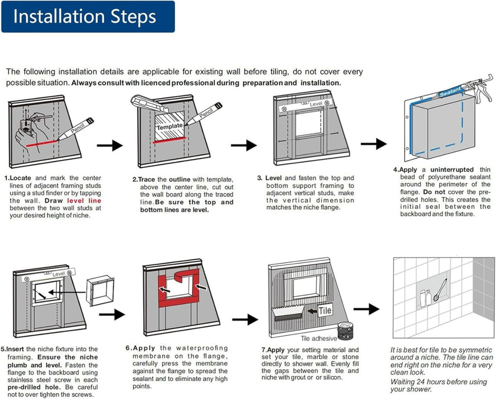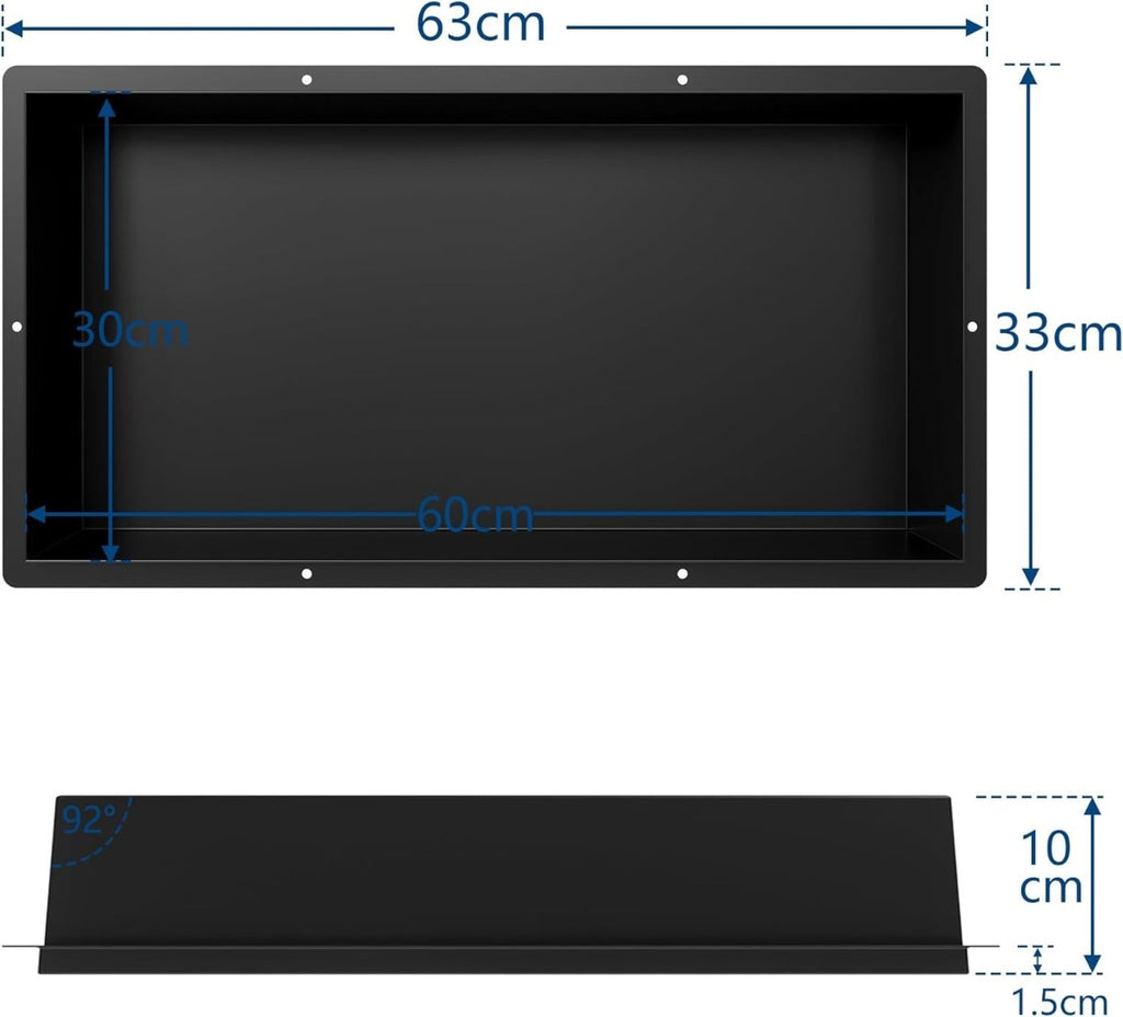 Products Include: 60 x 30 x 10 cm black stainless steel shower niche, product manual and cleaning sponge for daily cleaning