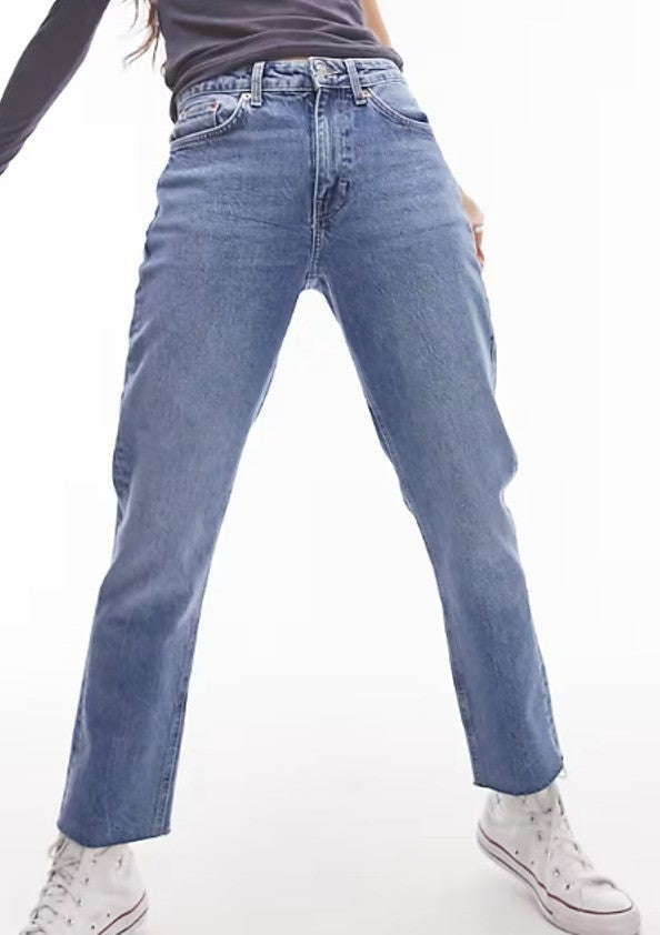 Topshop High Waisted Straight Leg Jeans in Bleach Raw Hems Mid Blue Size W26/L34
