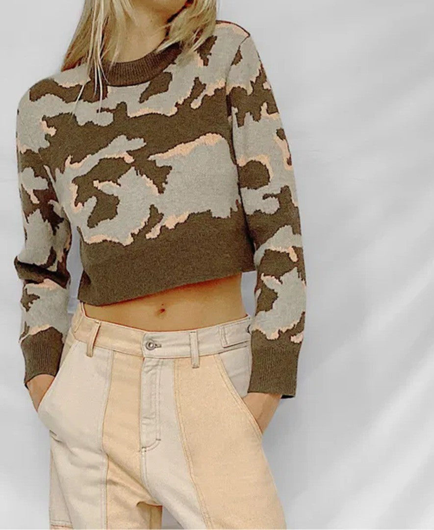 The epitome of modern military style, the Kylah Camo Crew Neck Jumper has a cropped silhouette, ribbed trims and tonal camouflage print in pastel hues.