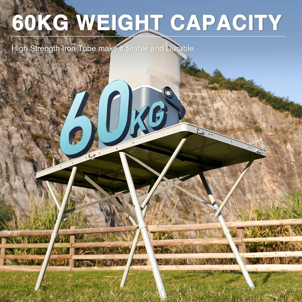 Large Size& Support 60kg: 120 x 60cm large size camping table, suitable for family or friends' gatherings(4-6 person). Designed with sturdy and solid construction, which make it possible for supporting up to 60kg.