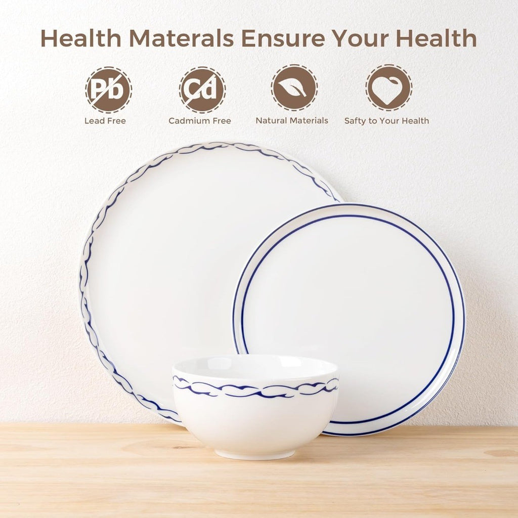 LEAD-FREE AND SAFE DINNER SET: Unlike other ceramics, our plates and bowls set is crafted from degradable clay, completely free of lead and cadmium with an all-natural glaze. No need to worry about harmful substances leaching into your drinking and food. Twice-fired premium ceramic makes it sturdy, durable and chip-resistant for long-term use