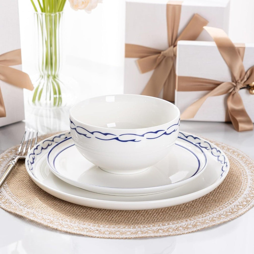 WHAT'S IN THE BOX: This series 12-piece dinnerware set includes 4Pcs 27cm Dinner Plates, 4Pcs 21.5cm Side Plates, 4Pcs 15cm cereal/soup bowls, making it a great set service for 4. Rest assured that every item has been thoroughly inspected to guarantee its safe arrival without breakages