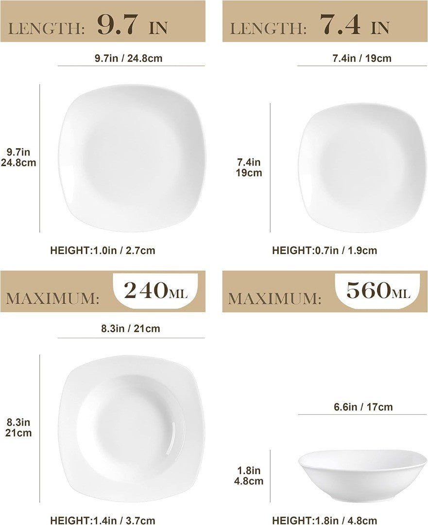 Complete Dinner Service Set for 6: Host Flawless Gatherings. Includes 6x Dinner Plates (9.7"), 6x Dessert Plates (7.4"), 6x Soup Bowls (8.3"/240ml), 6x Cereal Bowls (6.6"/560ml). Ideal for: Family dinners Sunday brunch Holiday feasts Wedding registries