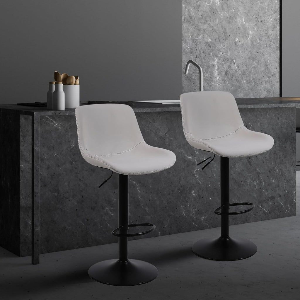 Modern Ermnois bar stools with swivel seats, adjustable height, and padded backrests. Upholstered in white PU leather, these armless stools are ideal for kitchen islands, breakfast bars, or counter-height dining.
