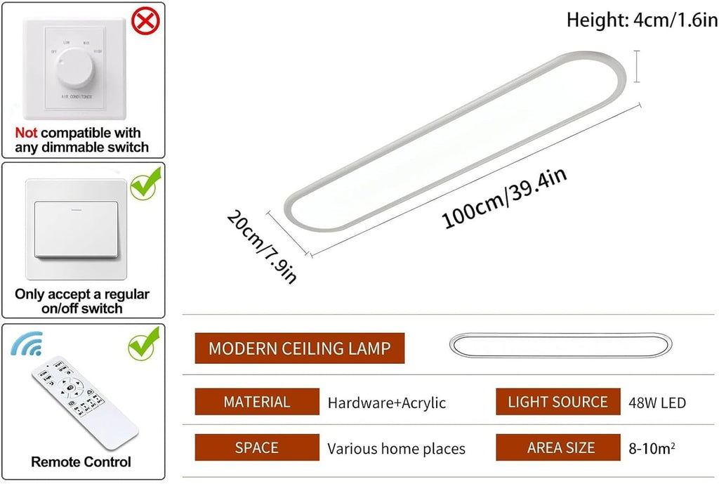 Ultra Thin LED Ceiling Light: This 100cm/39.4cm long linear LED ceiling light is only 4cm/1.6in thick, made of high quality fireproof plastic and metal, waterproof, anti-corrosion and heat sink housings, dimmable ceiling light . makes it very easily discreet and recessed, adapting to most interior furnishing styles.