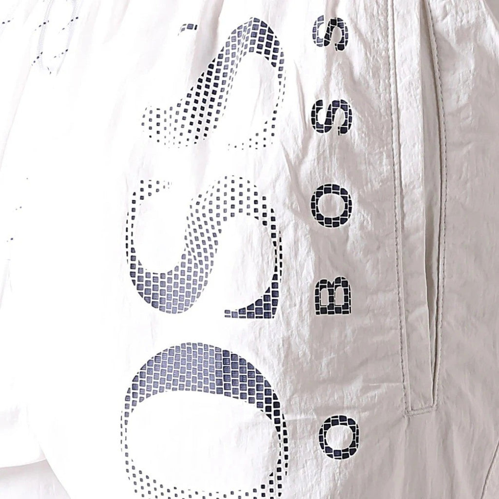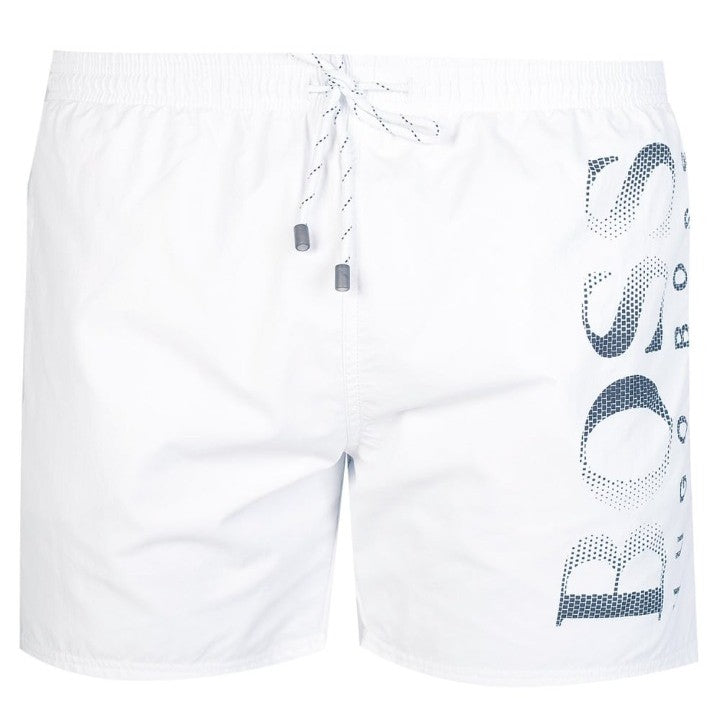 Quick-dry swimming shorts with an elasticated drawstring waist, side pockets, back pocket and mesh lining.