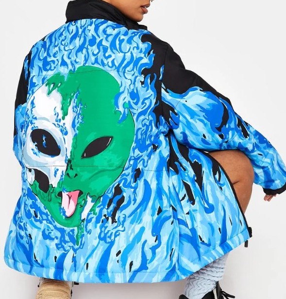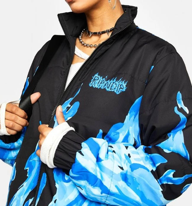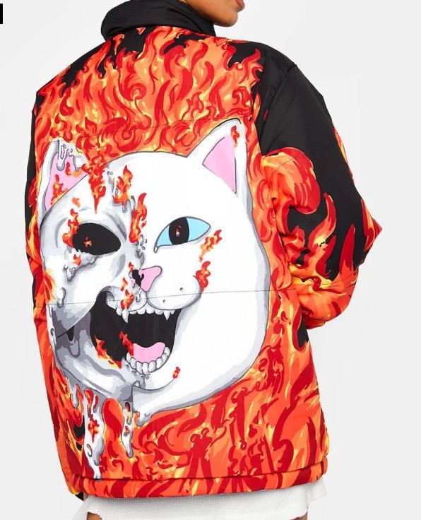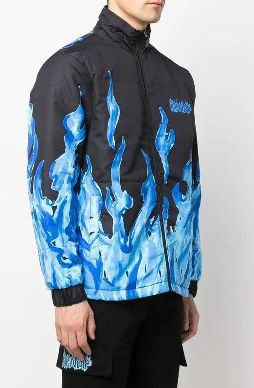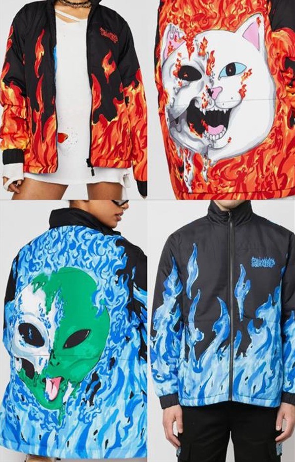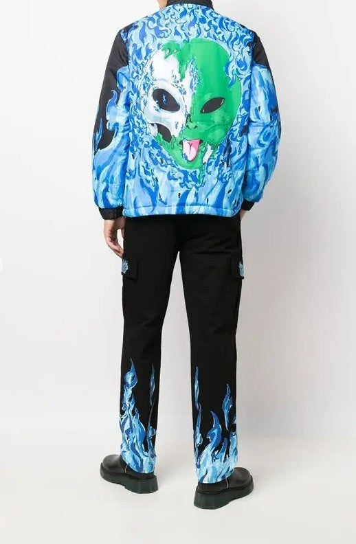 This puffer jacket is reversible with both Lord Nermal and Lord Alien graphics with a flame print, elastic sleeve cuffs, side pockets, and a front zipper closure.
