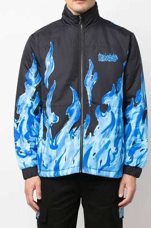 Black/blue/red Heaven And Heck reversible puffer jacket from Ripndip featuring padded design, reversible, flame print, all-over graphic print, logo print at the chest, stand-up collar, front zip fastening, two front welt pockets, long sleeves and straight hem.