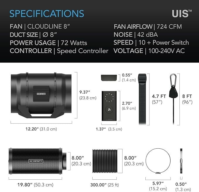 AC INFINITY Air Filtration Kit Cloudline Lite Fan & Carbon Filter 8in