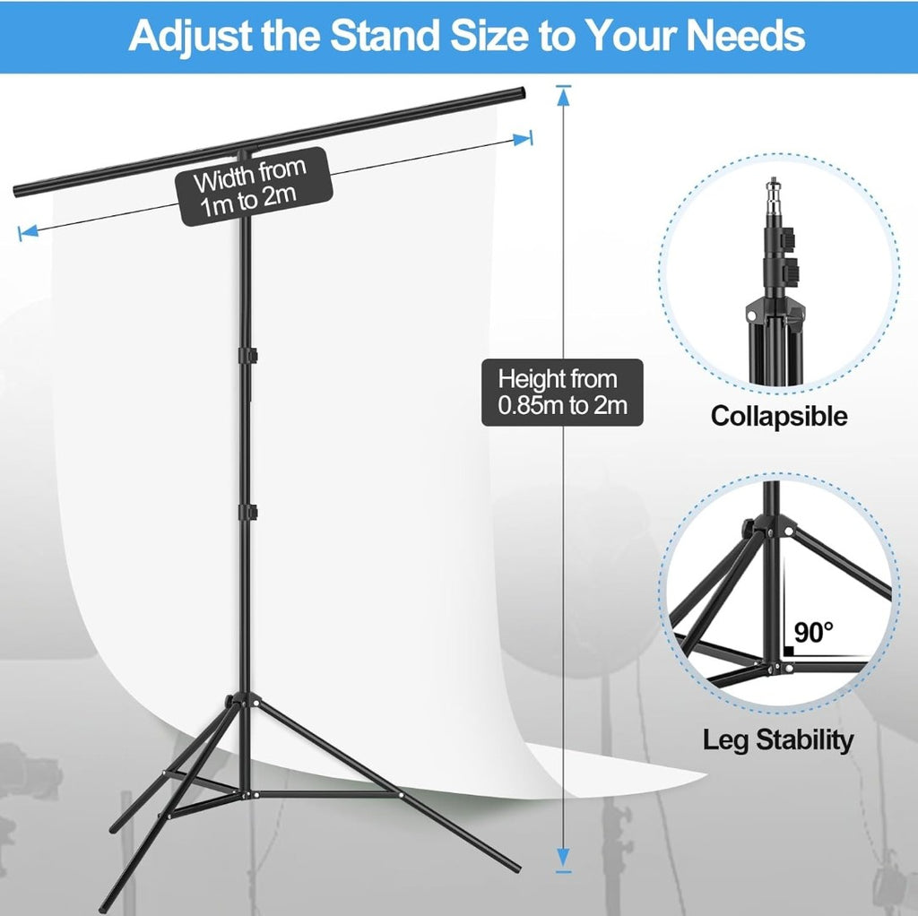Portable T-shape Backdrop Stand: Backdrop frame is effortlessly installable and detachable, with adjustable height ranging from 0.85m to 2m. The 2 crossbars seamlessly connect, allowing for adjustable width from 1m to 2m. Set the tripod stand leg at a 90-degree angle for optimal stability