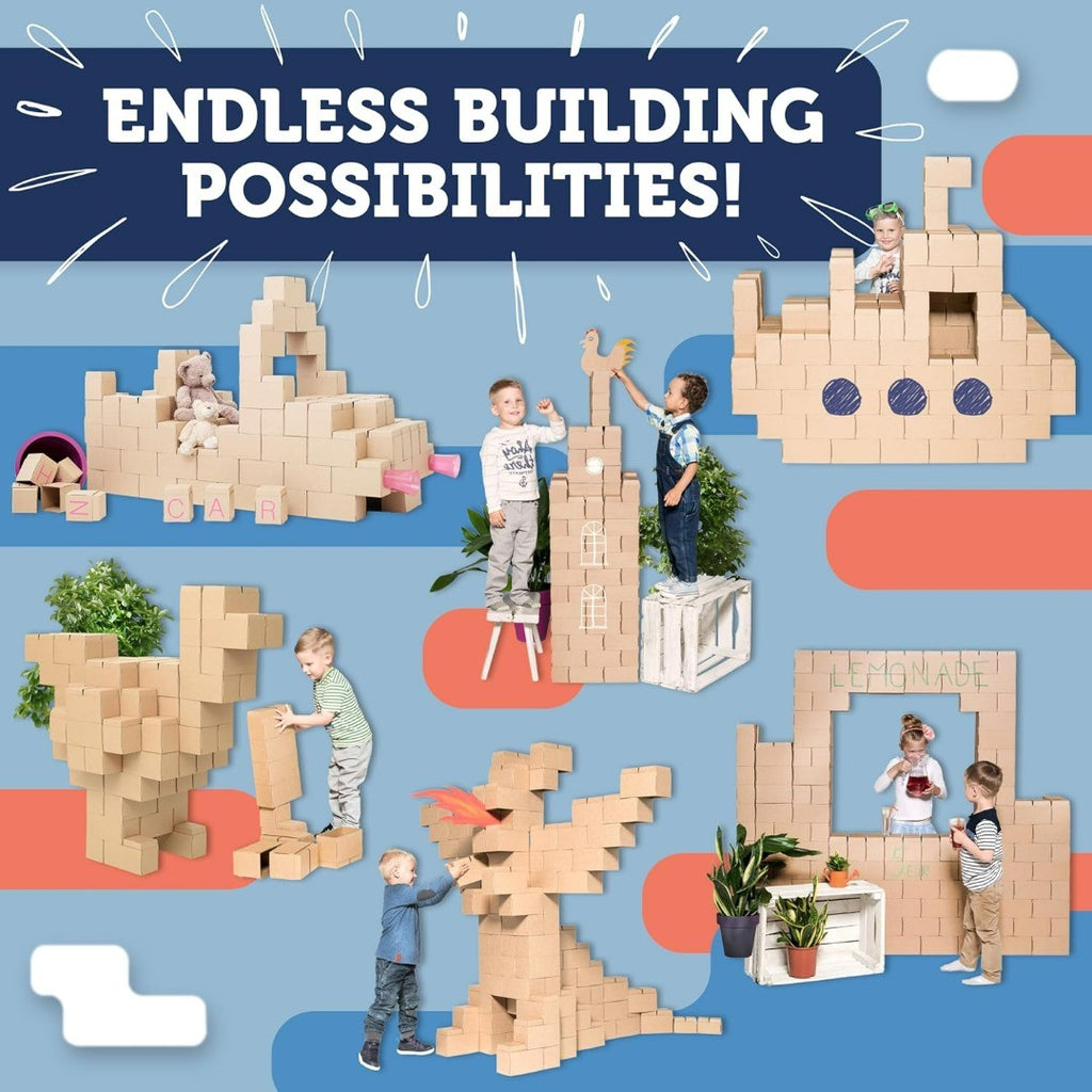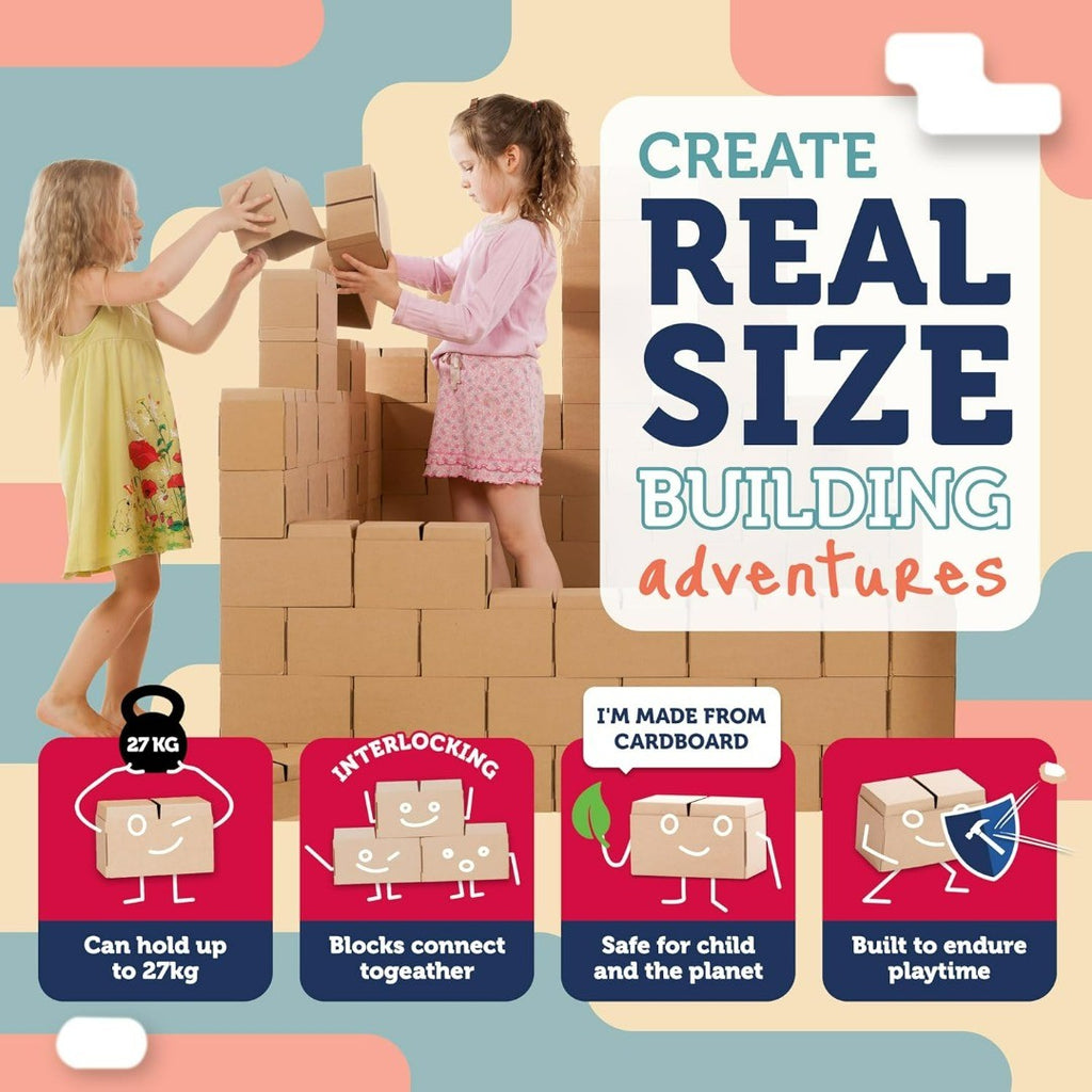 STRONG, EASY & DURABLE! Our mega building blocks are stackable, interlocking, and built to last. Made from sturdy cardboard, they support up to 27 kg, ensuring safe and long-lasting play - exactly what you need for kids construction toys.