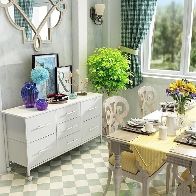 KIRVOVIY Chest of Drawers, Fabric Storage Drawer for Bedroom, TV Stand with 7 Drawers, Castors and Metal Frame (White)