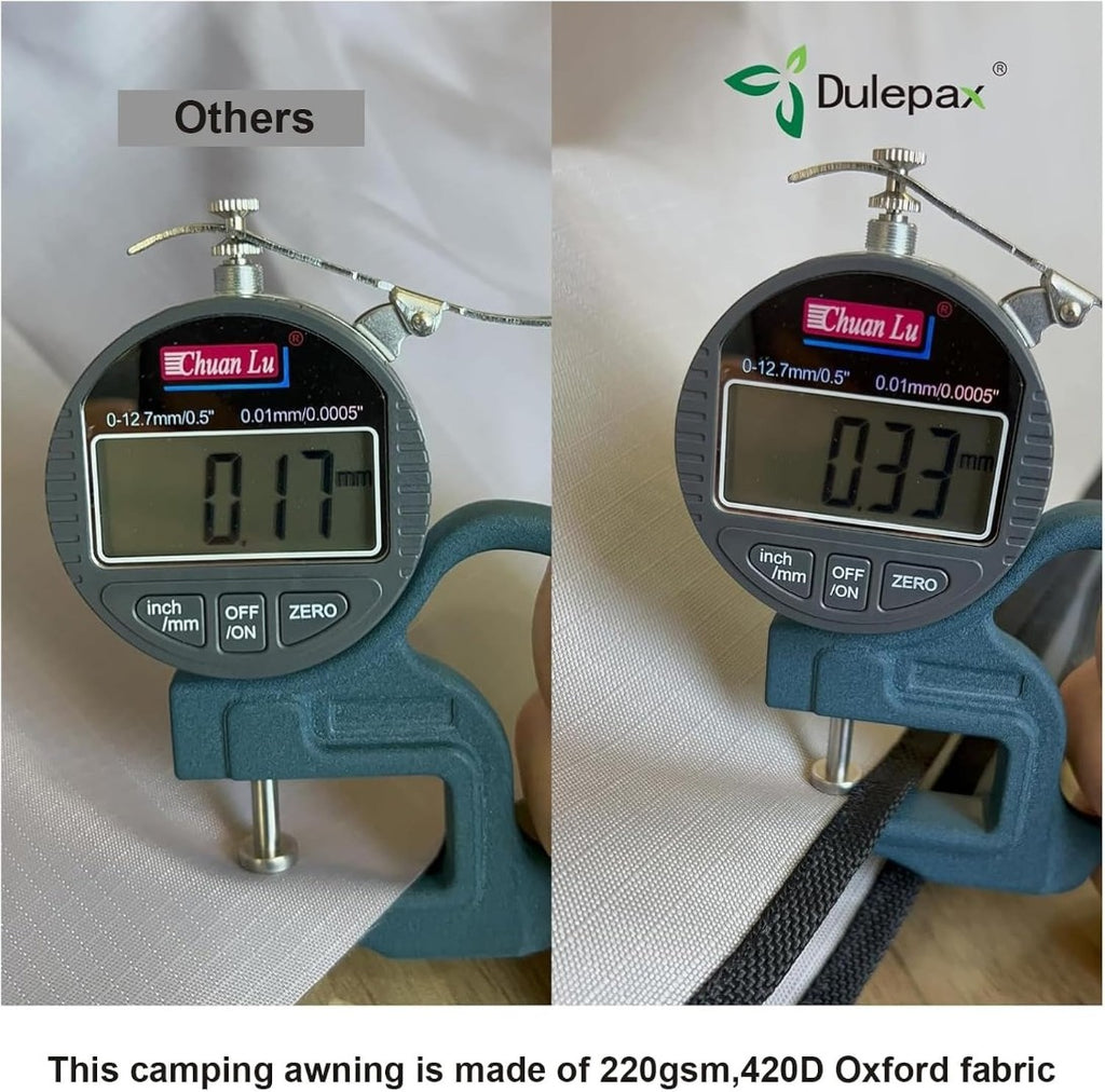 - Material: Dulepax camping awning is made of 220 g/m², 420D Oxford fabric with 3000 mm PU coating, has good waterproof, sun and tear resistance properties. Can be used as a temporary kitchen or a place for parties, picnics and other outdoor leisure activities