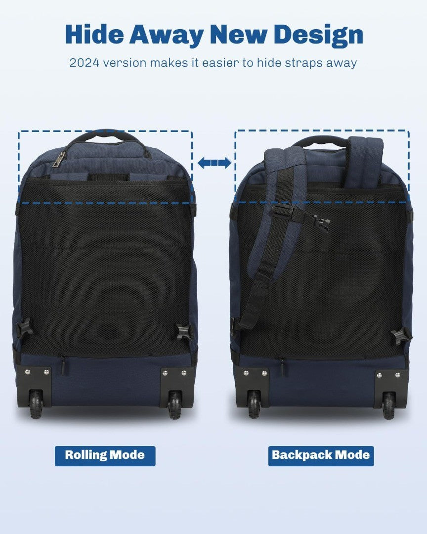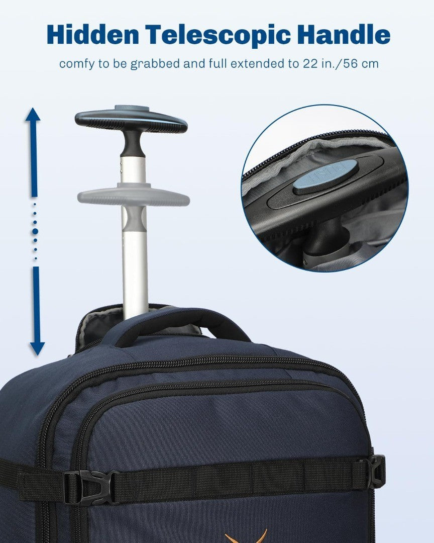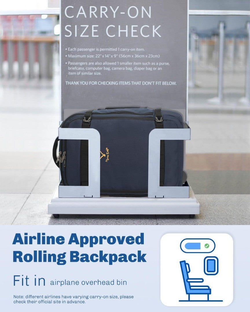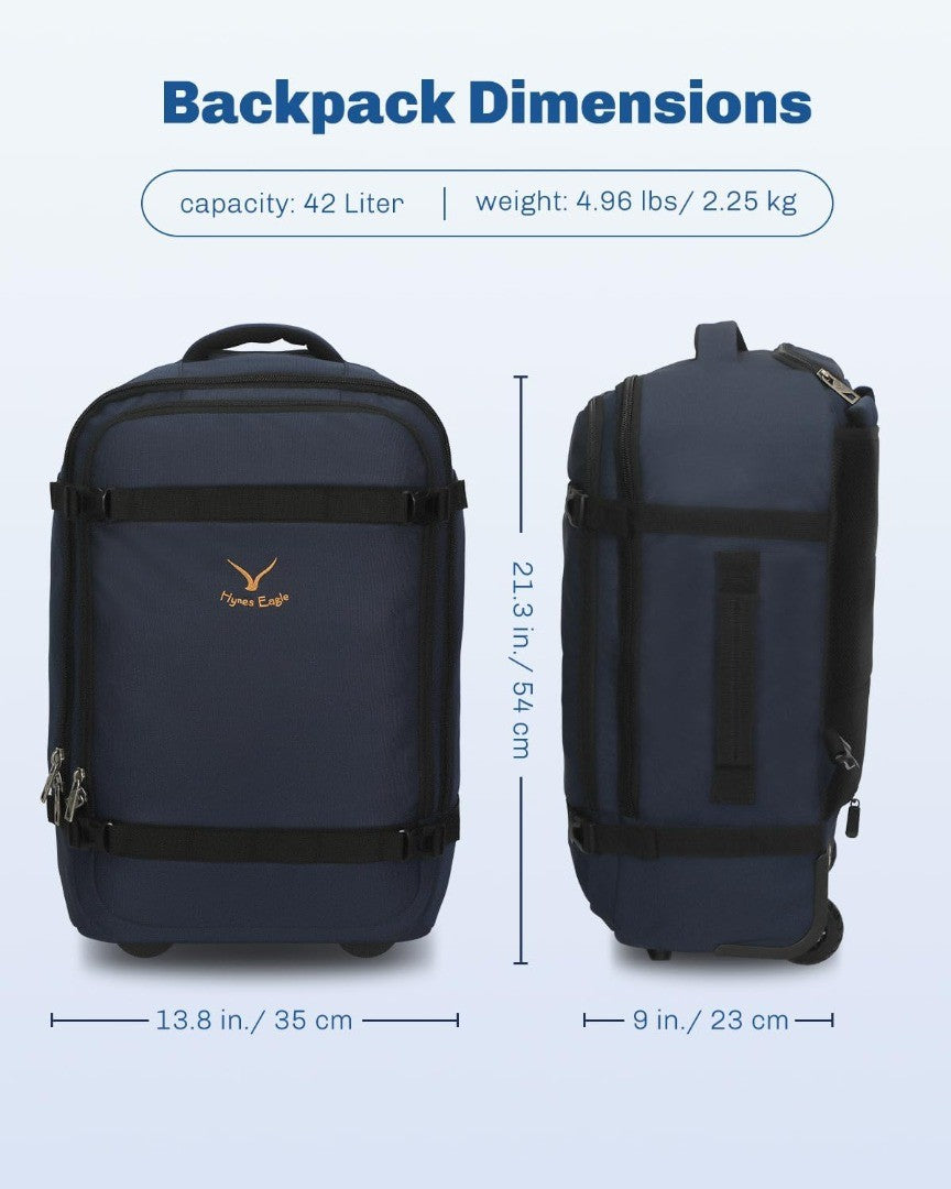 Hynes Eagle Travel Wheeled Backpack 42L Carry on Rolling Backpack 17 inch Laptop Rucksack with Wheels Large Flight Approved Hand Luggage Roller Cases Suitcase Blue with Water Bottle Pocket