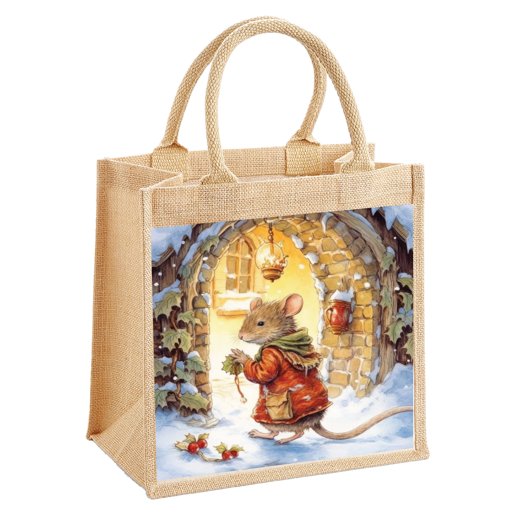 Victorian Christmas Mouse Jute Shopping Bag - This Jute Shopping Bag is perfect for carrying your everyday essentials. Made from durable jute and sized at 280x280, this sturdy bag is printed in the UK with a design on the front. It's ideal for shopping trips and also makes a thoughtful gift for yourself, friends, or family.