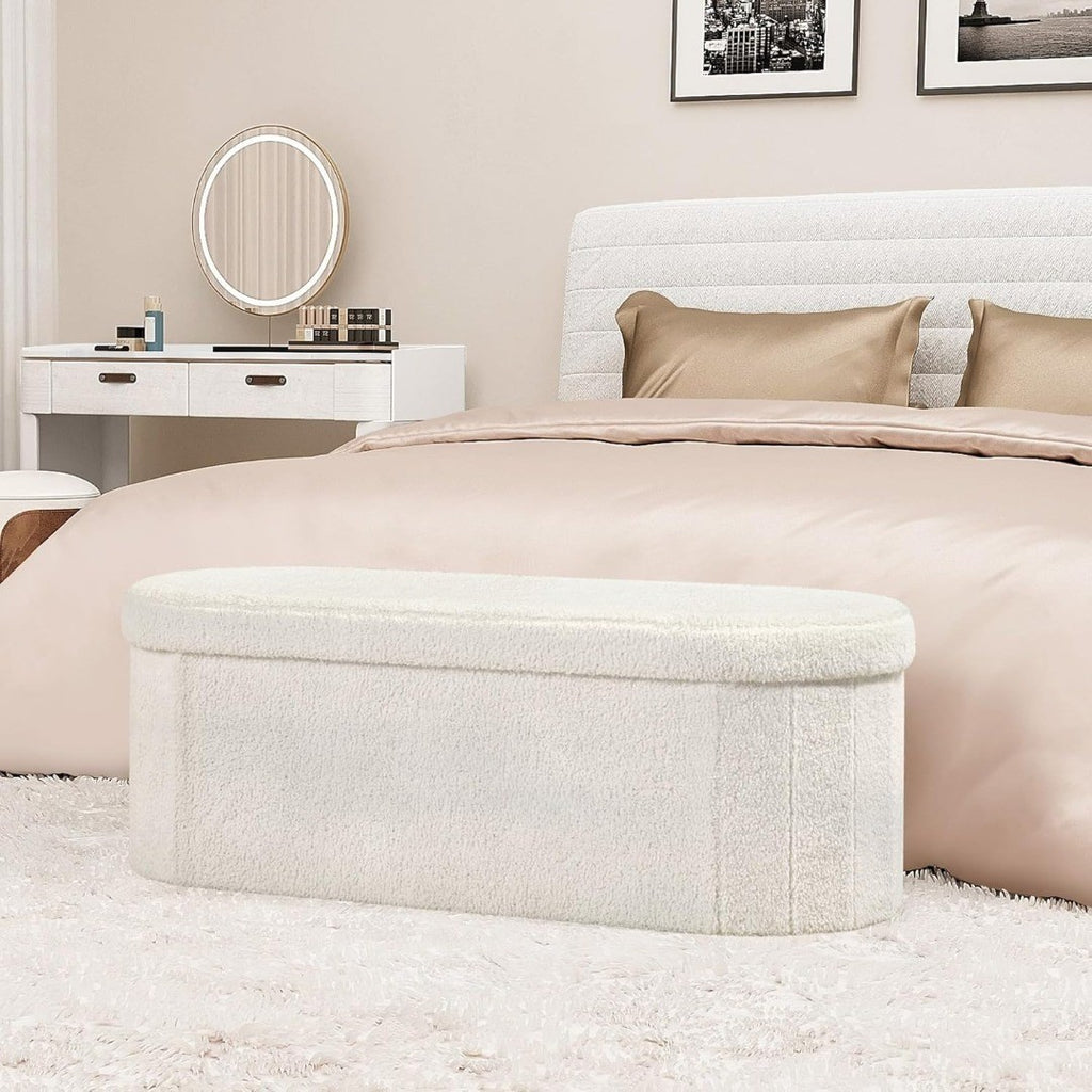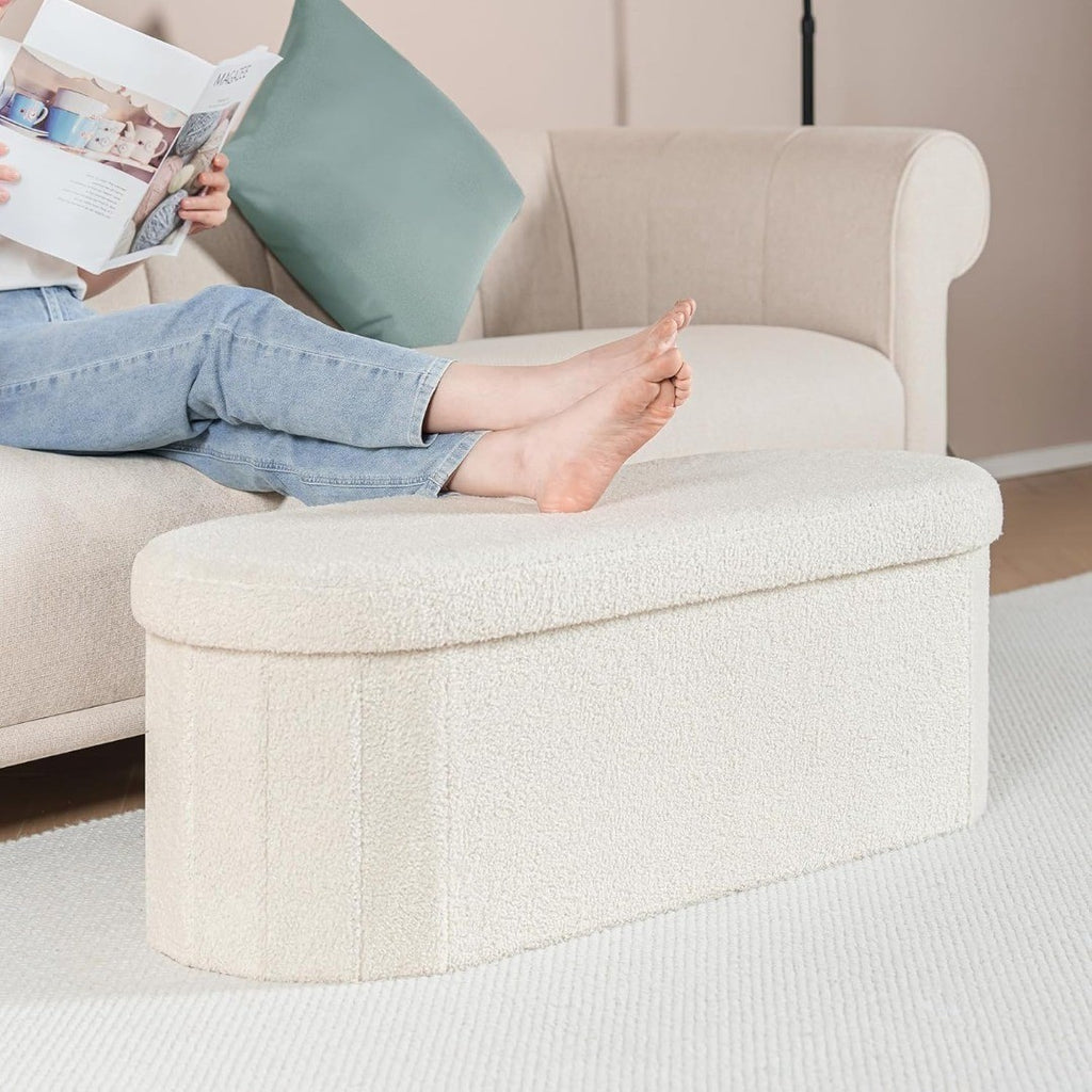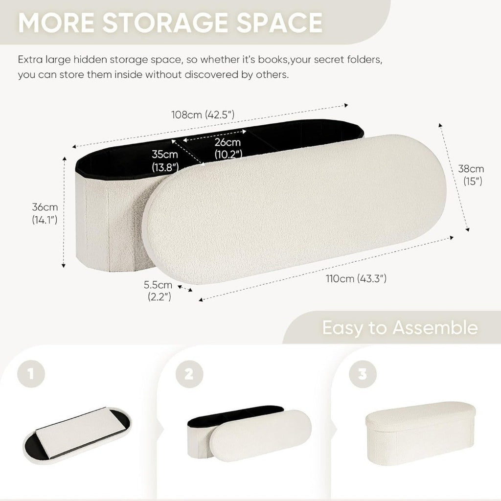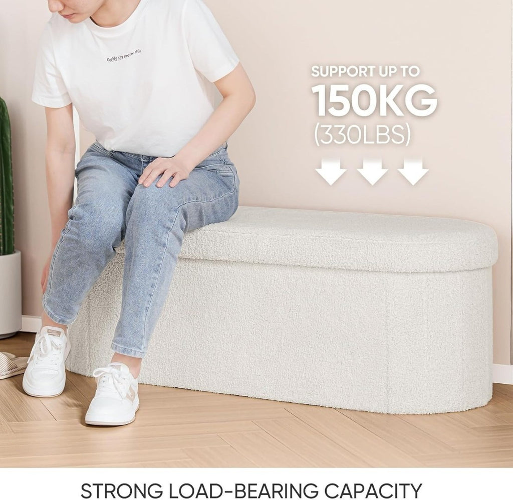 Bonlife Folding Ottoman Storage Bench, Boucle Footstool Oval, End of Bed Stool, Ideal for Living Room, Bedroom, 100L Storage Space, White