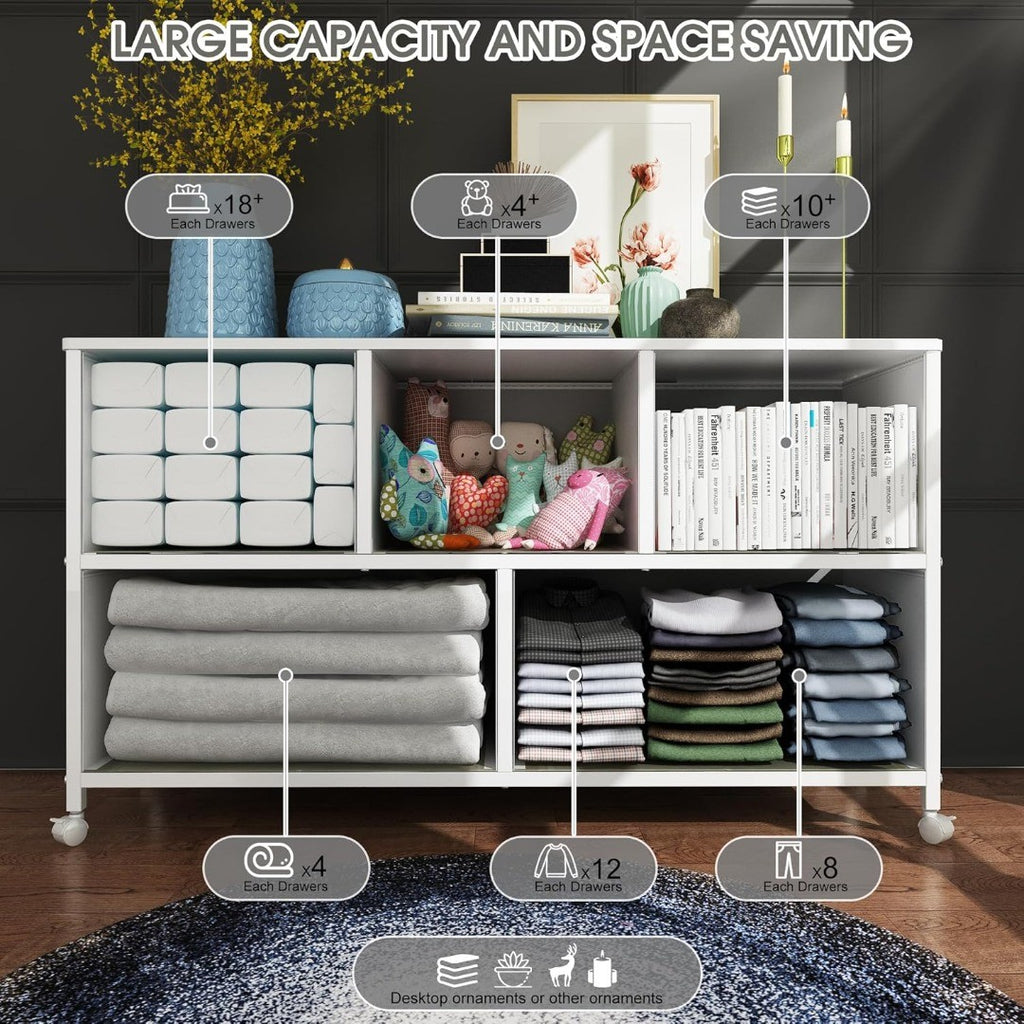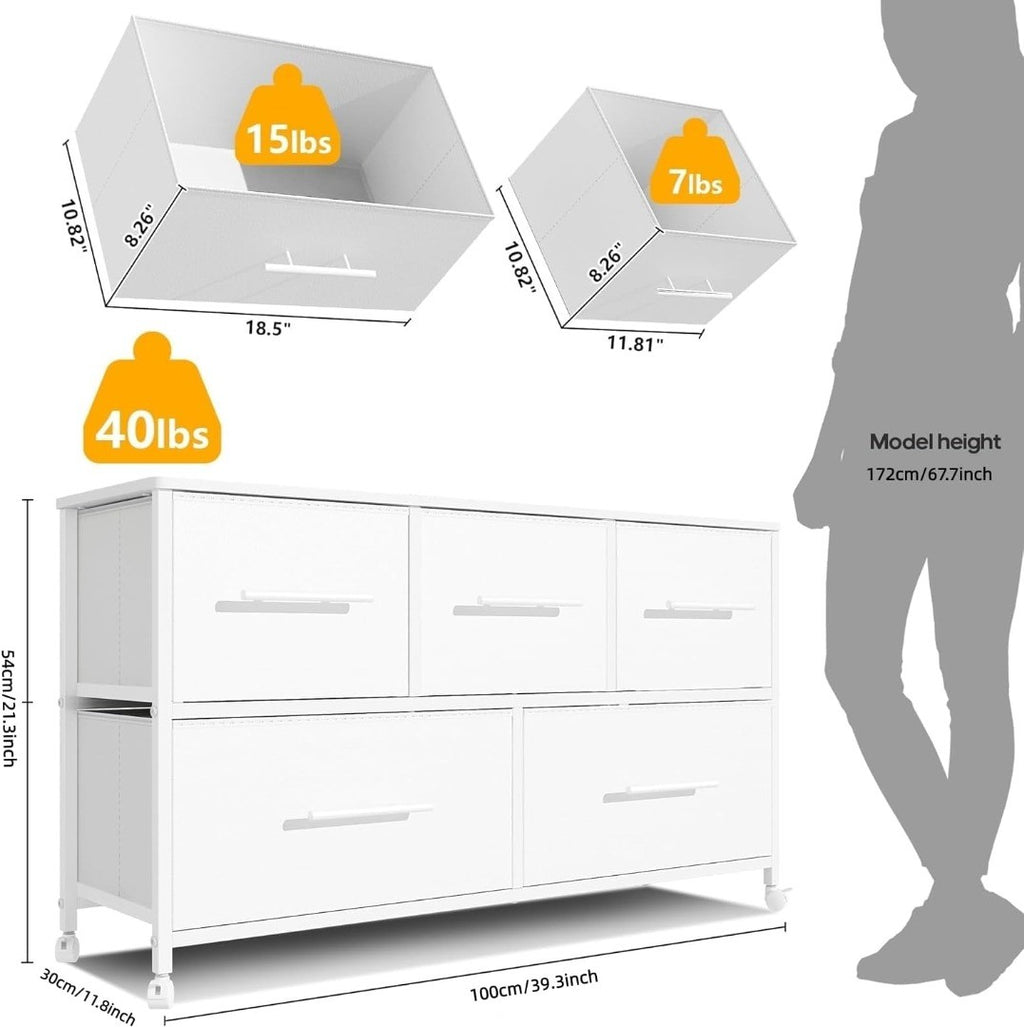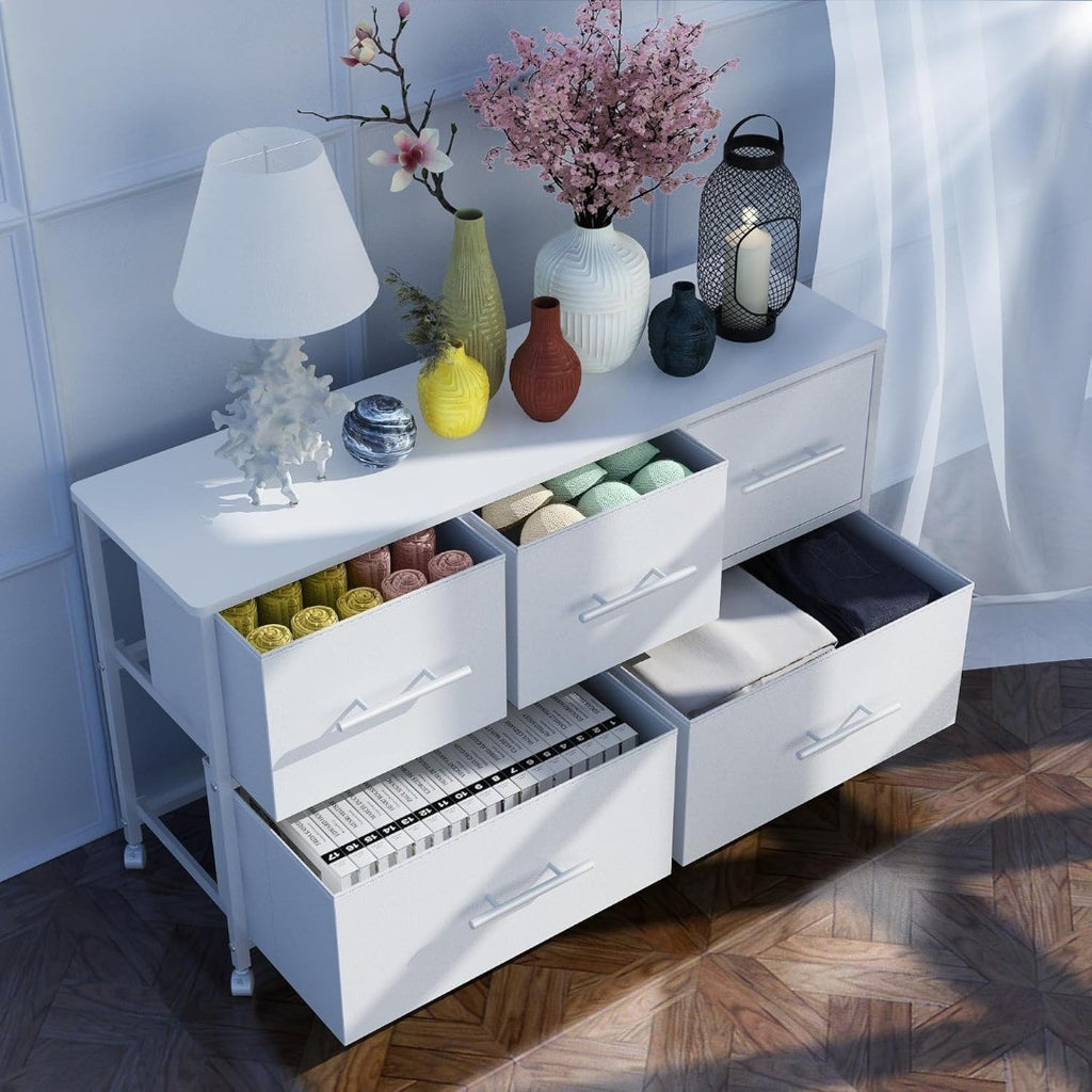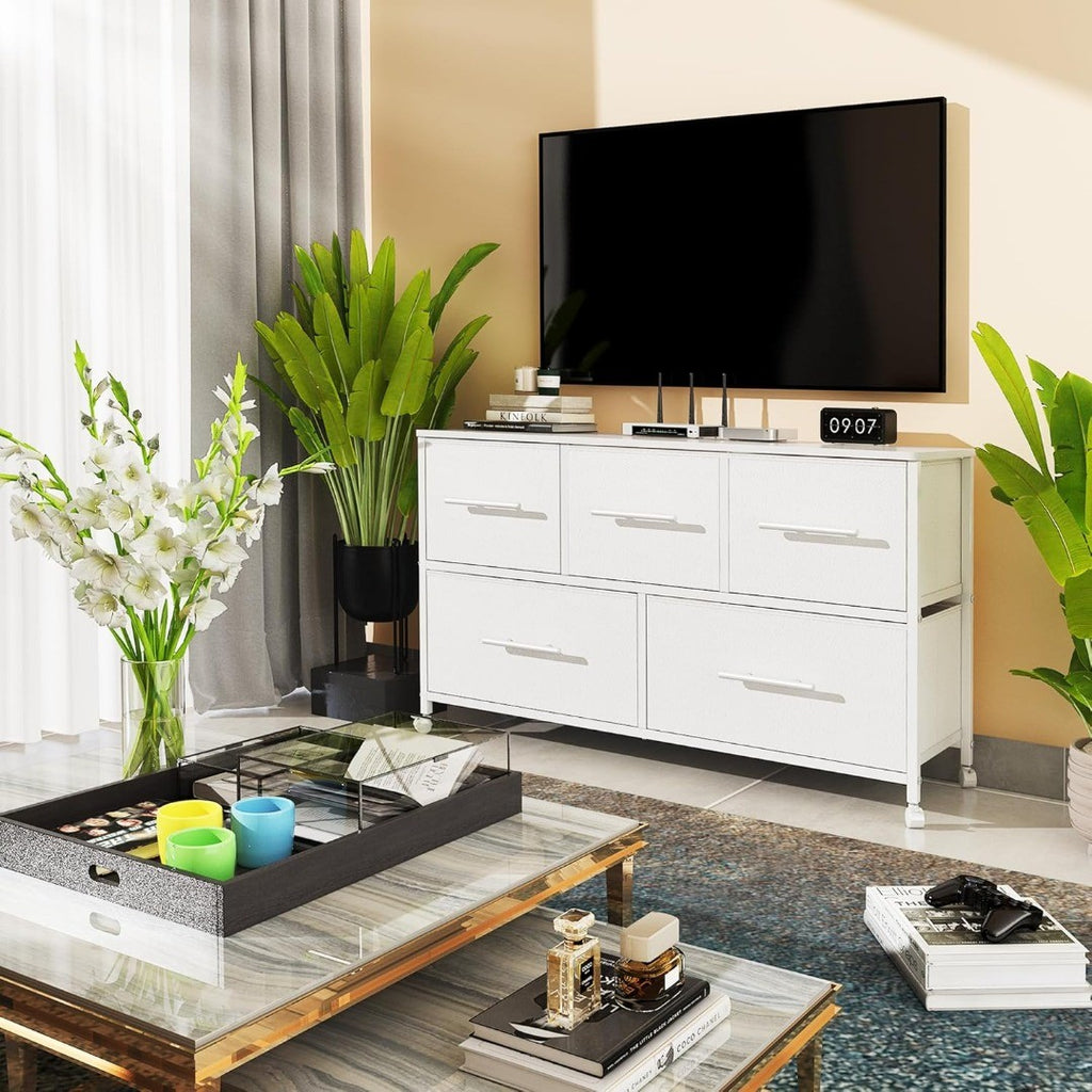 Storage Dresser TV Stand with 5 Fabric Drawers White