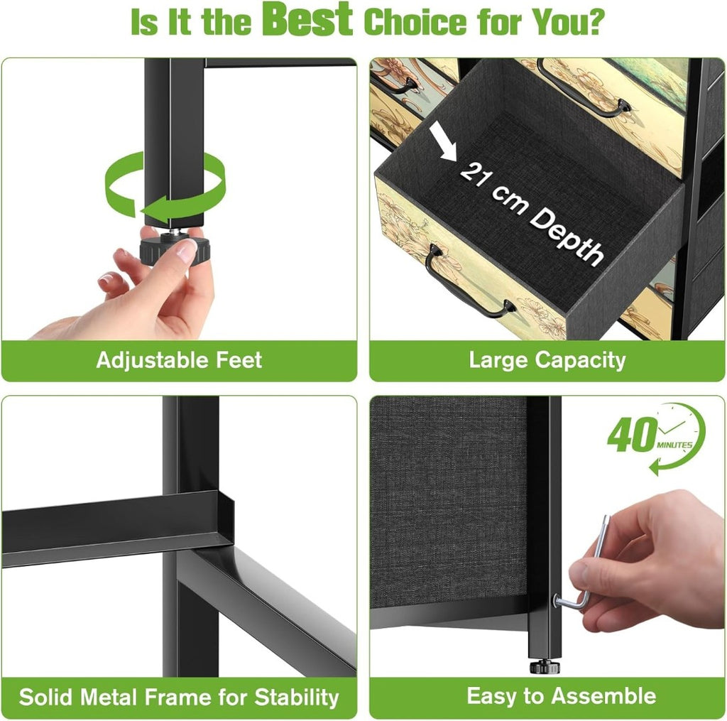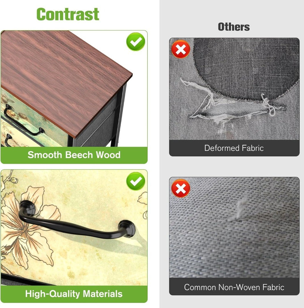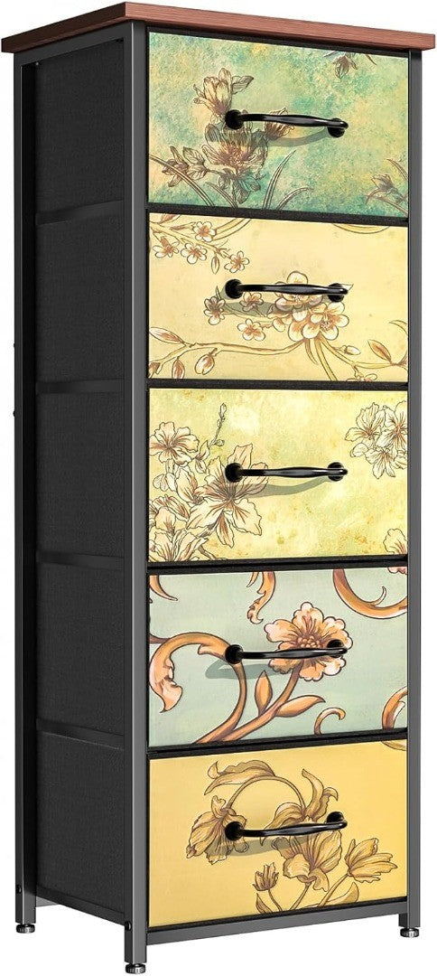 5 Drawer Tall Chest of Drawers Bedroom - Fabric Storage Drawer with Wood Top Dresser for Bedroom, Hallway, Living Room, Closet Flower Printing