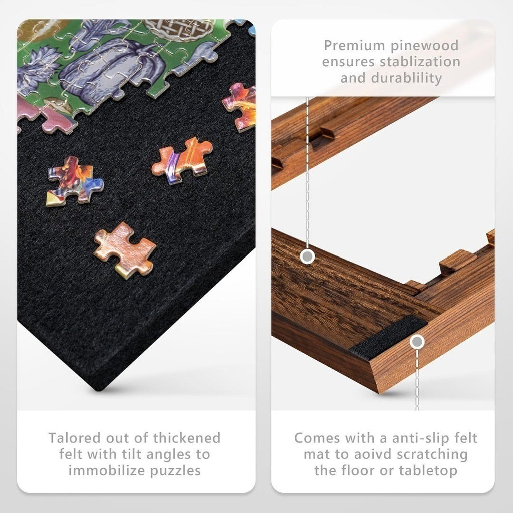 Premium Material - Processed out of hardened and thickened felt fabric, stopping puzzle pieces from sliding even when it tilts at a small angle. The pinewood stand offers further support and ensures stability and durability. Besides, an anti-slip felt mat for protection against scratches and stability.