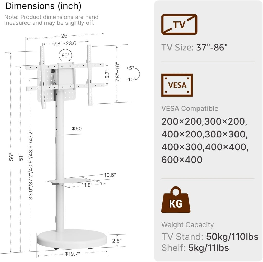 Height Adjustable Rolling TV Stand for 37-86 Inch TV up to 110 Pounds, Portrait to Landscape, Heavy Duty Mobile TV Cart with Shelf Max VESA 600x400mm (White)