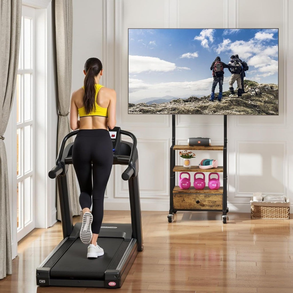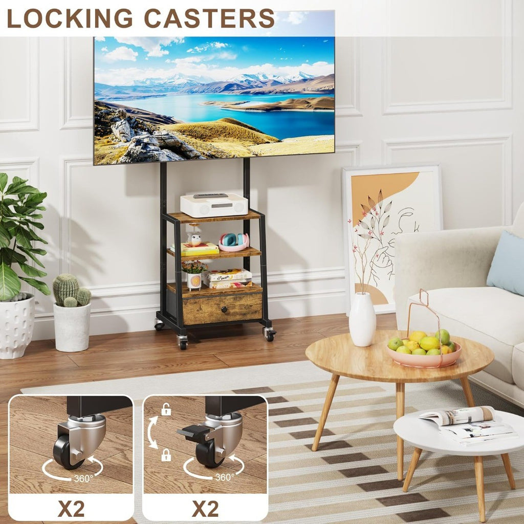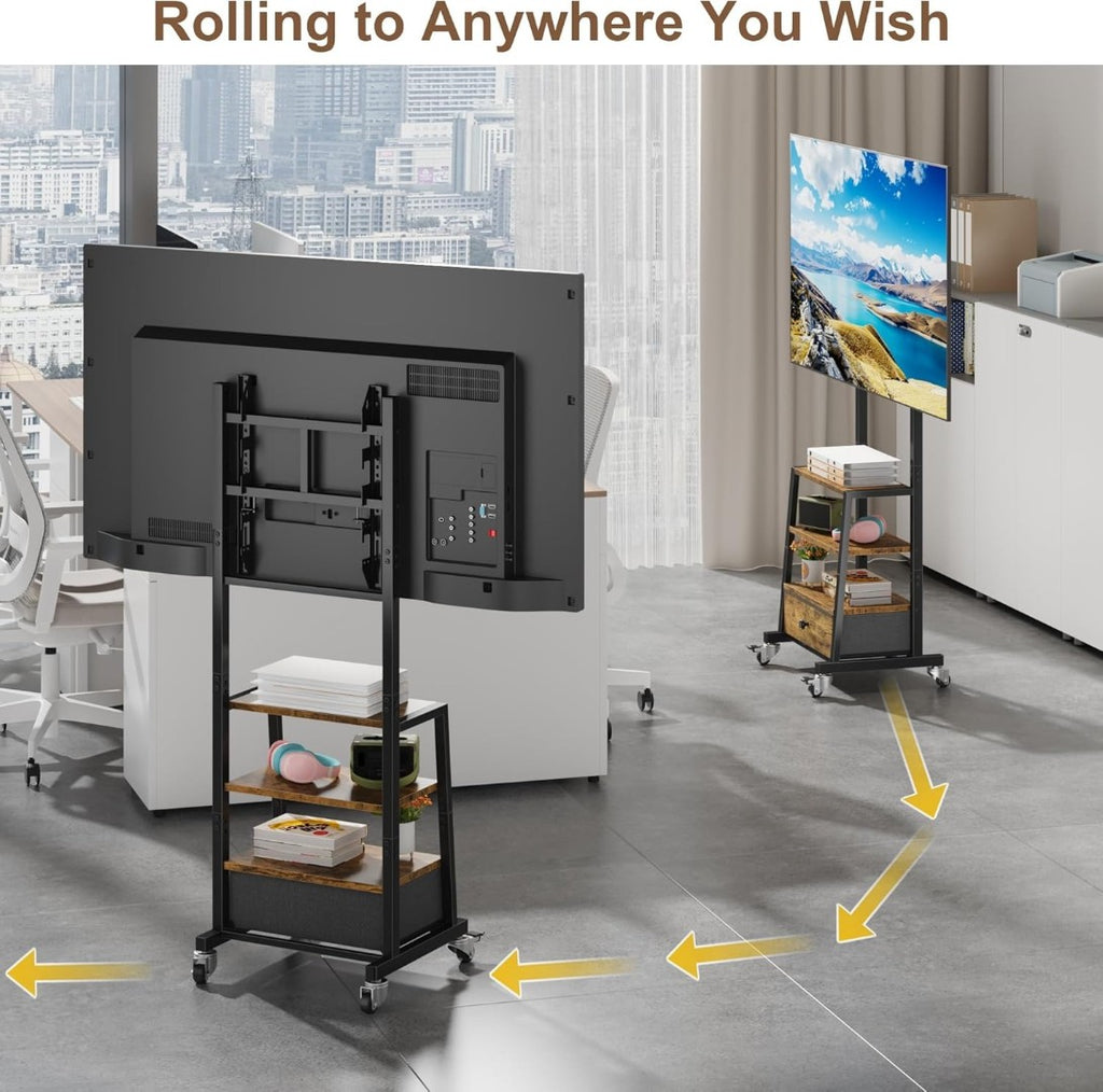Adjustable Height for Any Setup: Enjoy the perfect screen height on this rolling TV stand wherever you are—on the sofa, in bed, or standing. The stable mount lets you customise your viewing height for comfort and clarity.