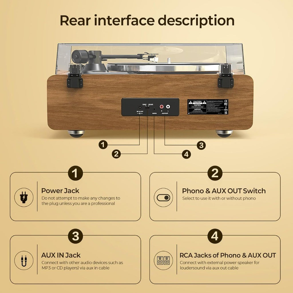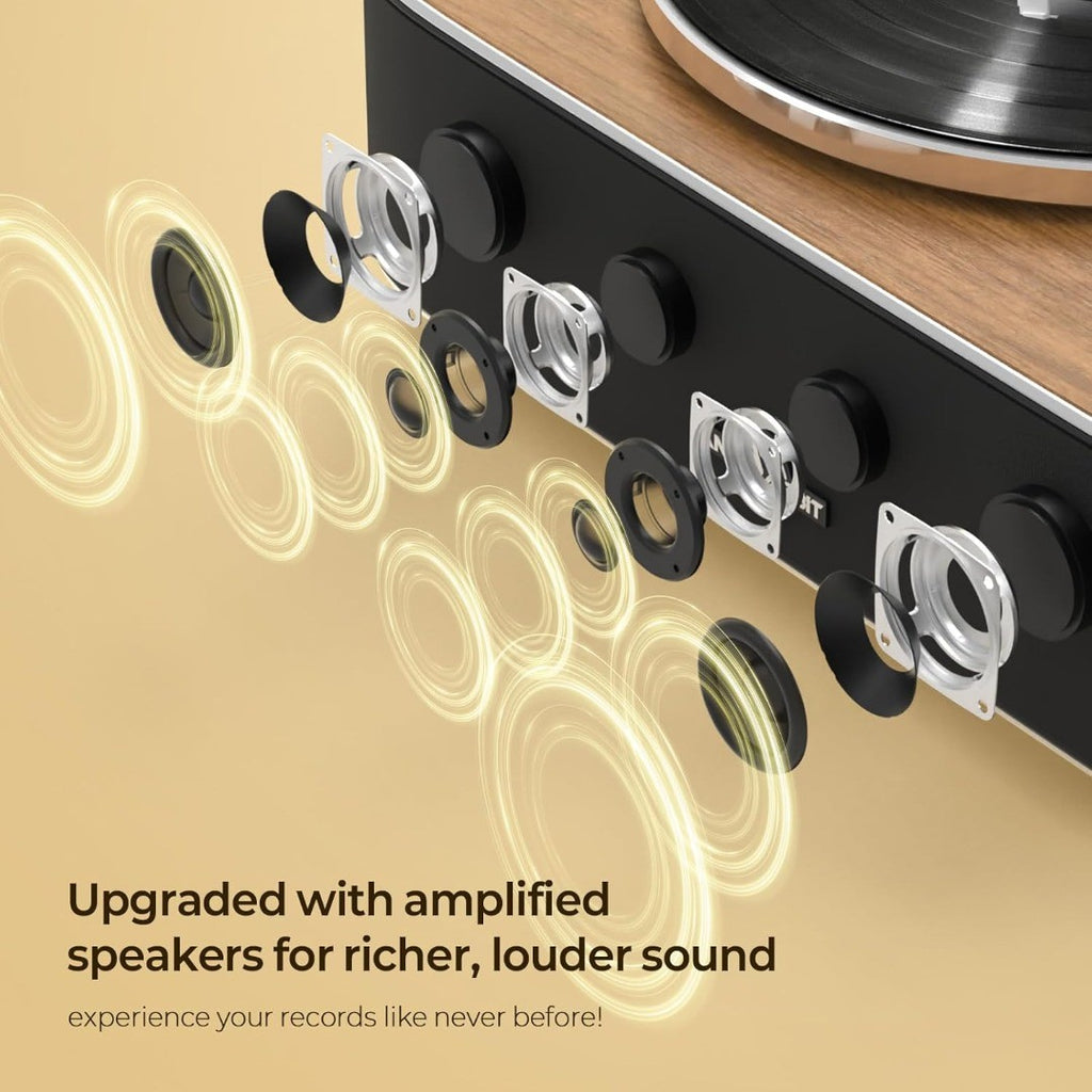 Quad Stereo Speakers - Upgraded 4-speaker system delivers louder, fuller sound with enhanced clarity — great for both vinyl and Bluetooth modes. Perfect for playing your favourite vinyl record player tracks or streaming digital music, all through a high-quality record player with speakers.