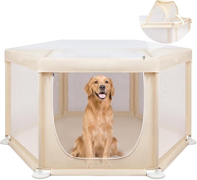 Bigger Space, Happier Pet: Our dog play pen indoors features an upgraded 58.3 x 58.3 x 29.9 inches hexagonal design, the spacious dog pen indoor gives your pets significantly more room compared to traditional cages, letting your furry friends play freely, relax comfortably, and live happily. Enjoy peace of mind knowing your pets are safe and content while you focus on your daily activities.