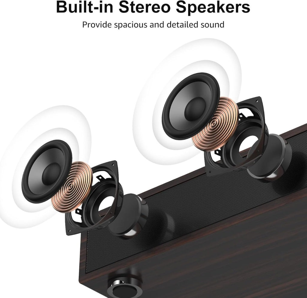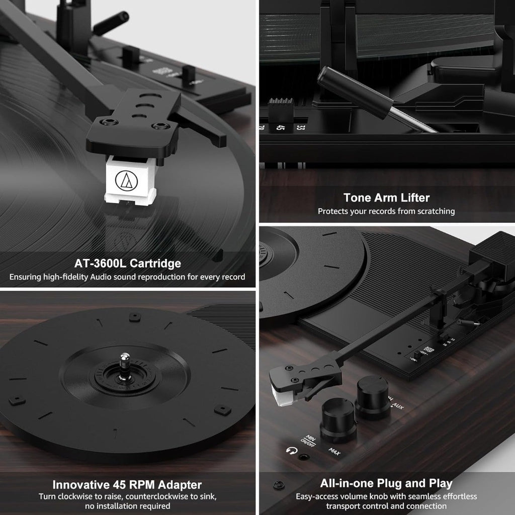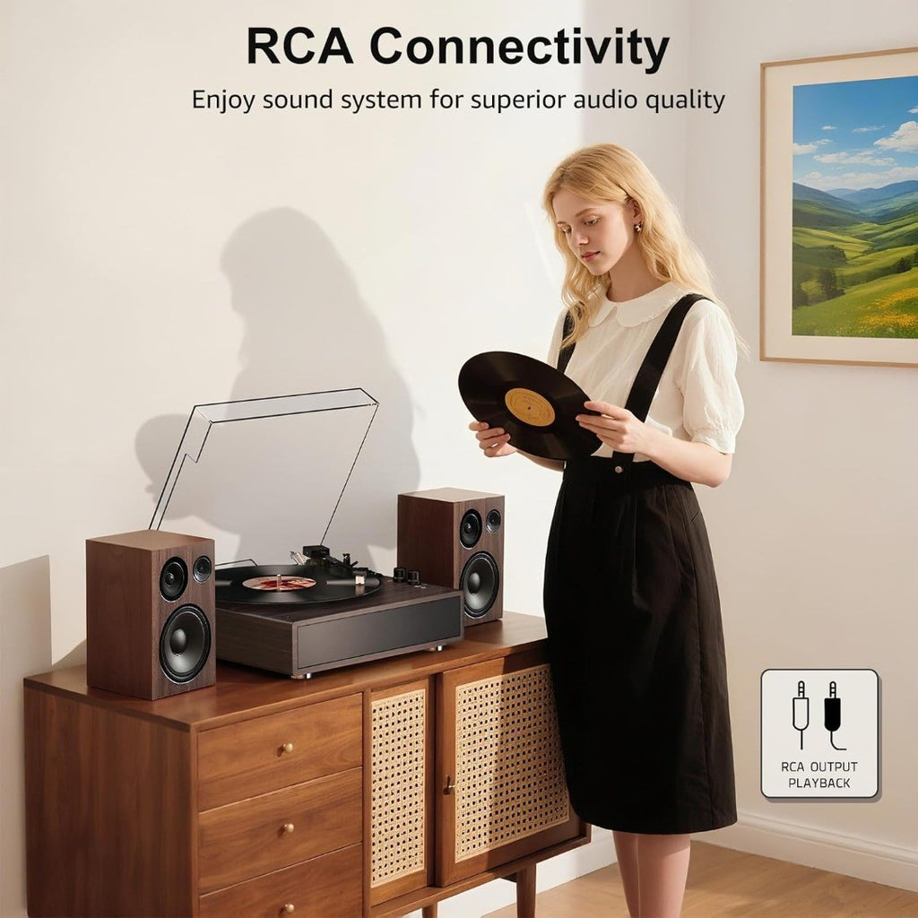 High-Fidelity Stereo Speakers Sound - One tweeter speaker deliver crisp highs and two deep bass speakers, balanced by advanced crossover technology. The 3-point support structure isolates the turntable from the acoustic cavity, creating an ideal anti-resonant platform for a pure, immersive analogue music experience. Tip: Please allow a break-in period of a few hours to 2 days at a mid-volume level for it to sound best