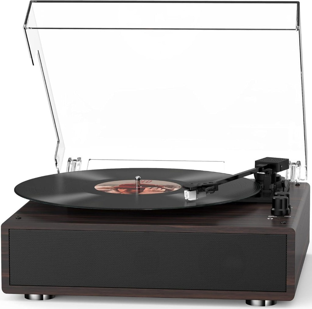 All-in-One Turntable - Built-in two bass and one treble speakers, Bluetooth 5.3 input, and supports 33 1/3, 45, 78 RPM vinyl (7", 10", and 12" records) and allows wireless streaming from any smart device (phone, tablet, etc.). Connect external speakers or headphones, AUX input for an enhanced audio experience