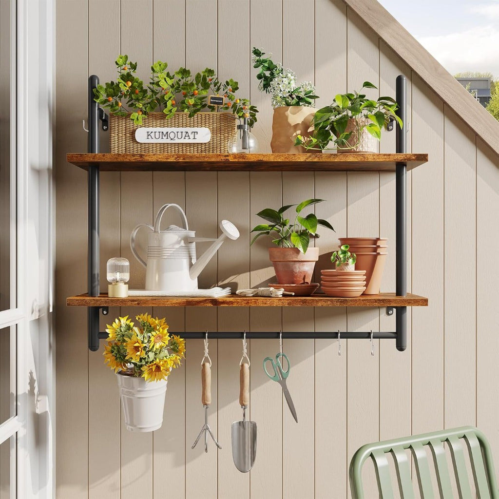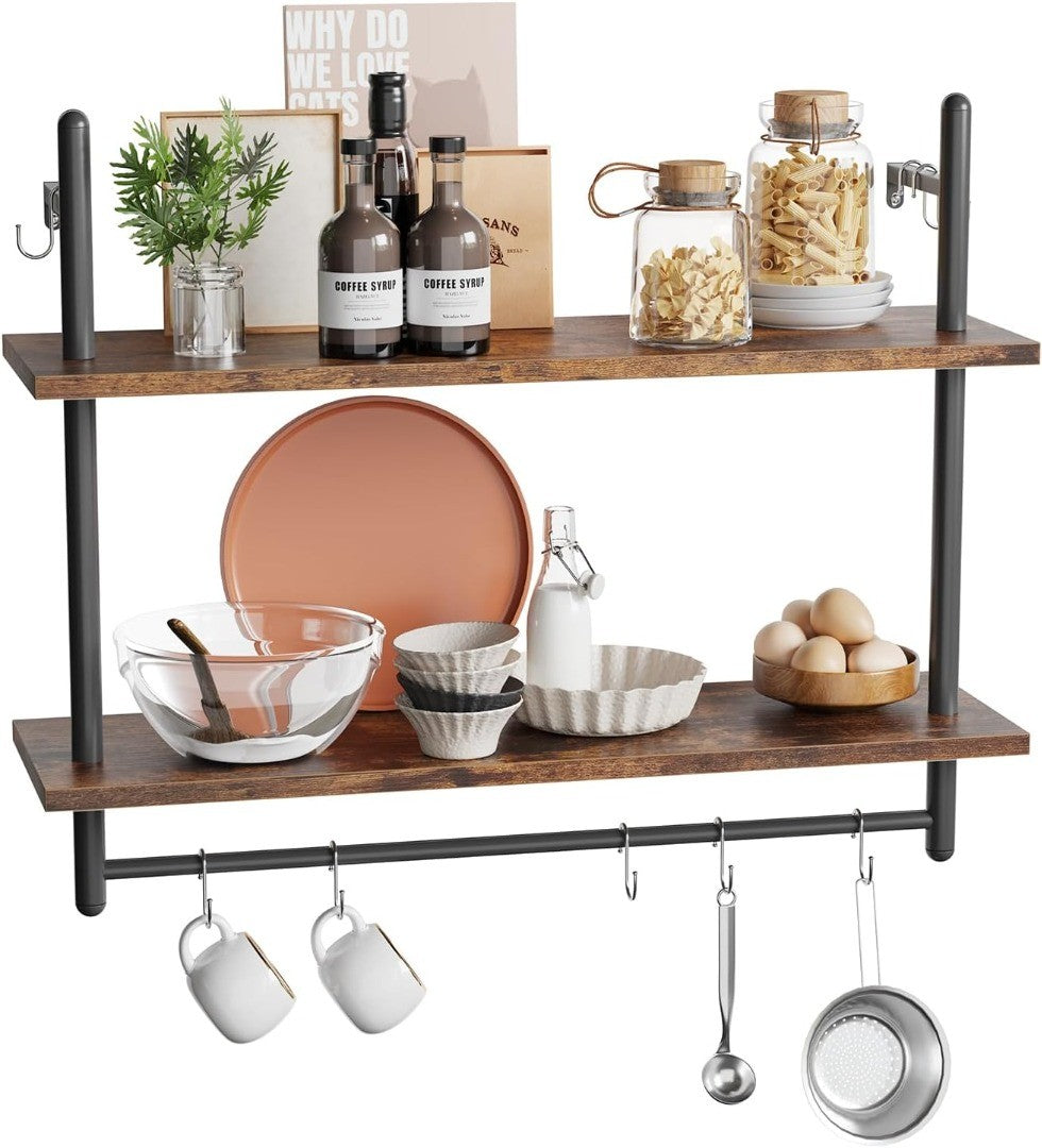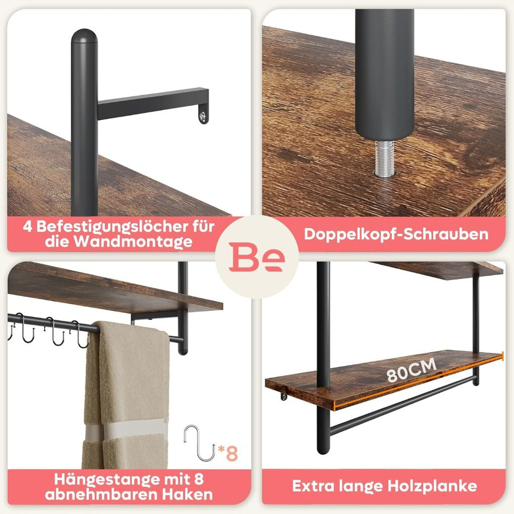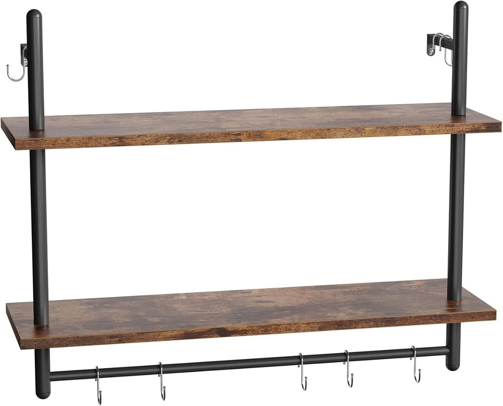 Bestier Industrial Pipe Wall Shelf, 80cm Floating Shelves with Towel Bar and Hooks, Rustic Wall-Mounted Storage Rack for Kitchen, Bathroom, Coffee Bar or Living Room (Rustic Brown)