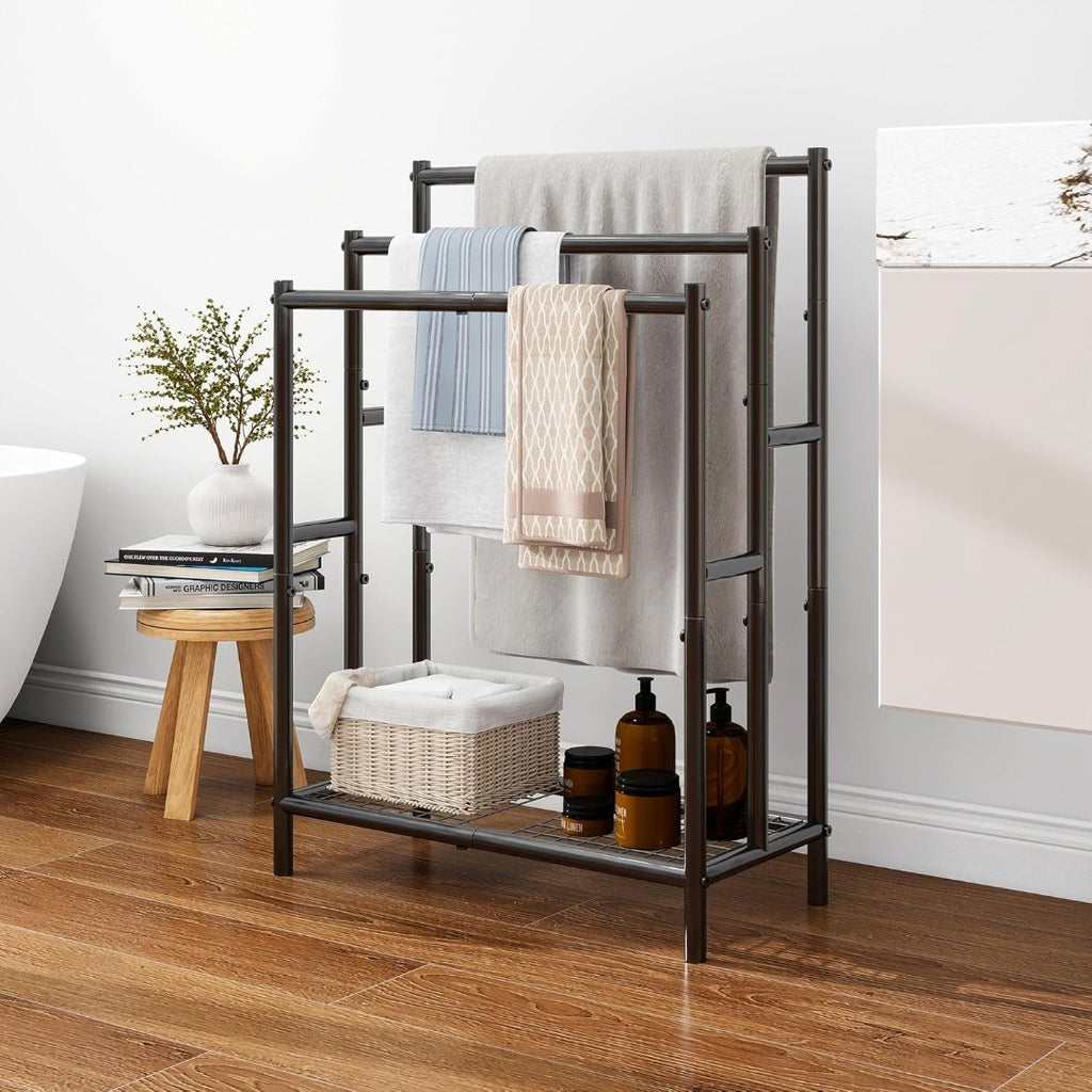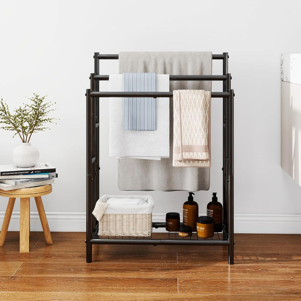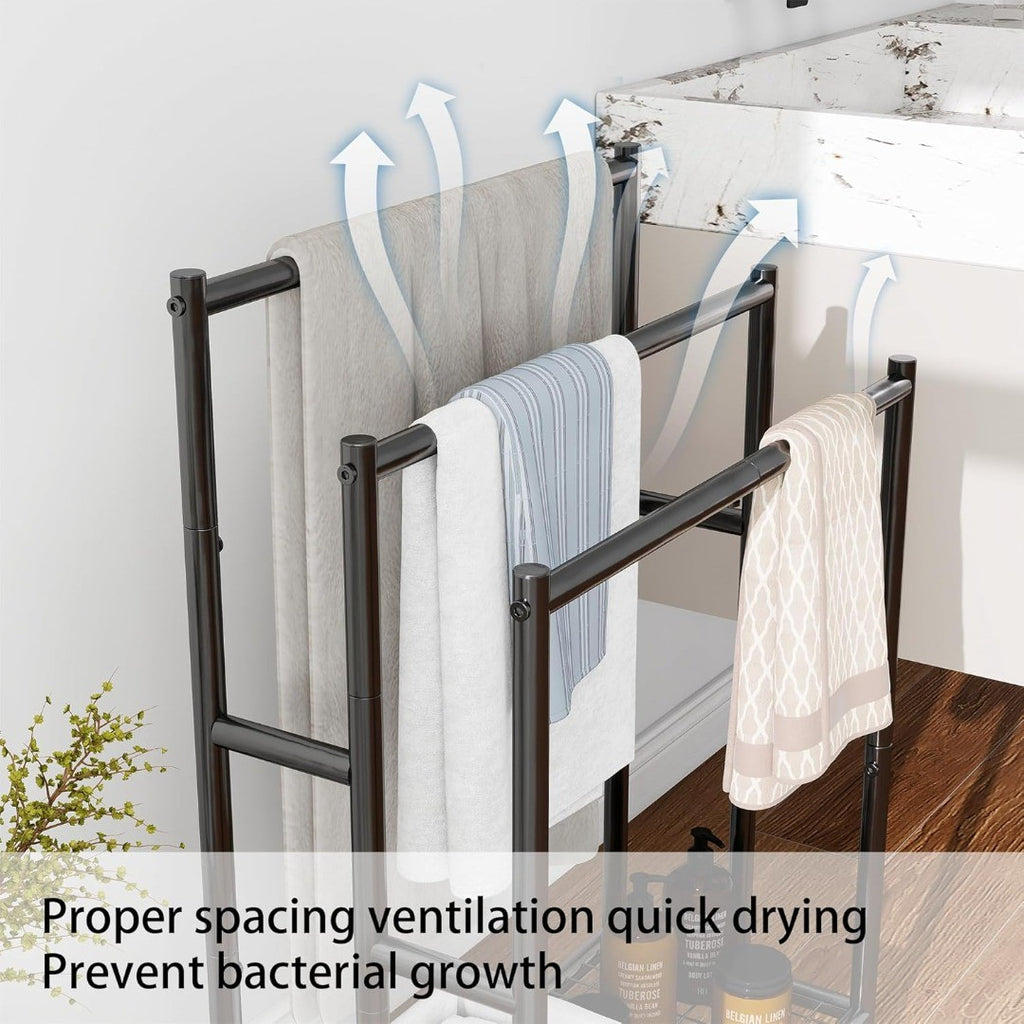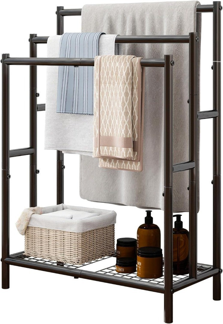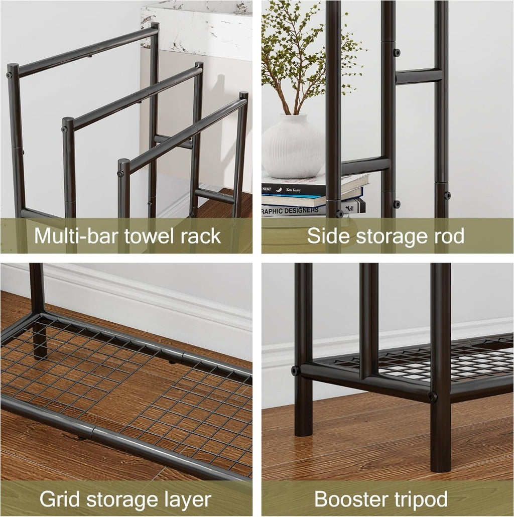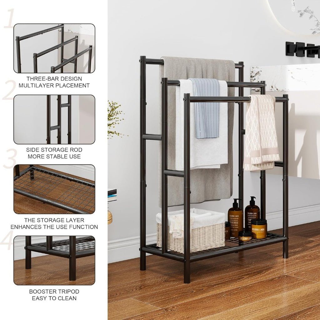 Freestanding Towel Rack,3 Tier Towel Holder Stand, Metal Towel Rail for Bathroom Laundry Room Bedroom,Industrial Drying and Display Rack with Shelf, Black