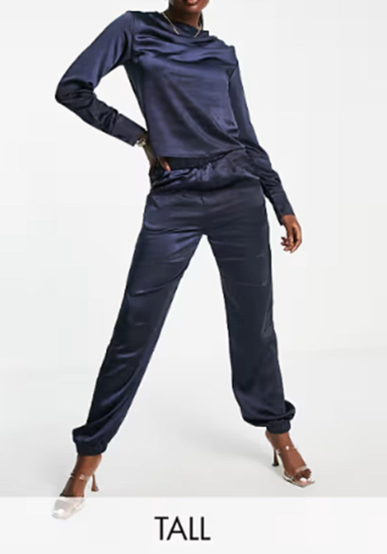 4TH & RECKLESS Tall Satin Ruched Long Sleeve Top co-ord in Navy, Size,: UK 12