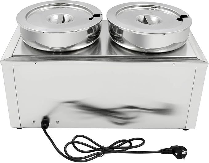 Commercial Bain Marie: Rated Voltage:220V-240V/50Hz-60Hz, Power: 1500W, Temperature rang: 30-85°C, Overall Dimension: 545 x 292 x 310 mm, Pan size: 7.4L x 2, with 2 compartments & lid included.