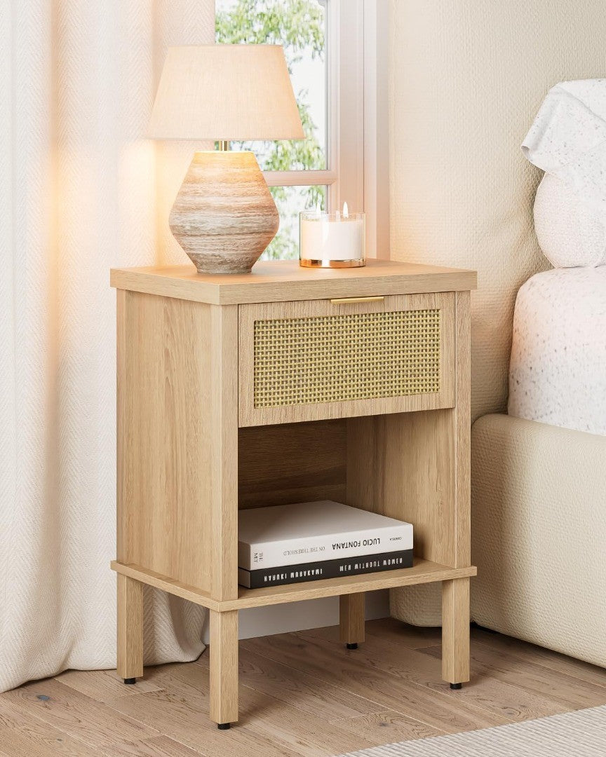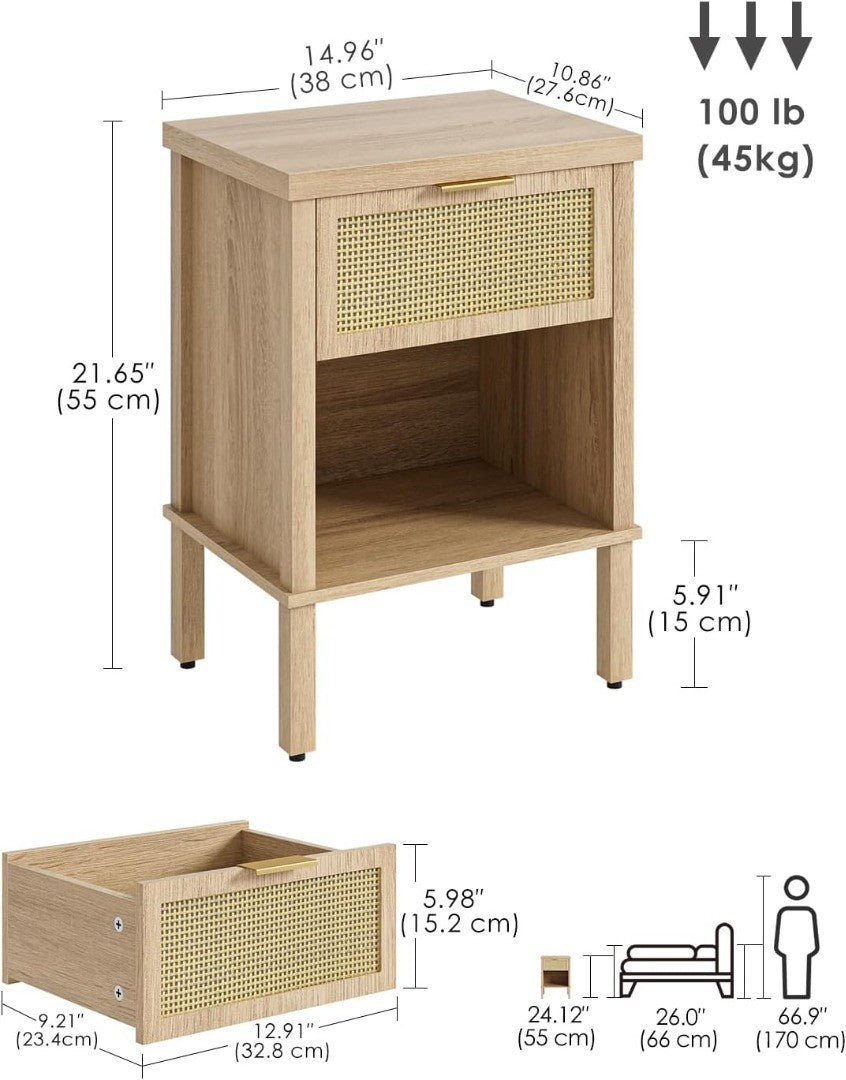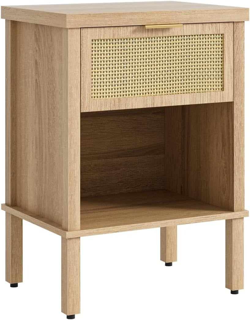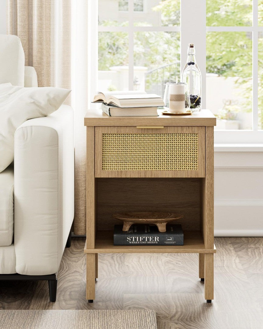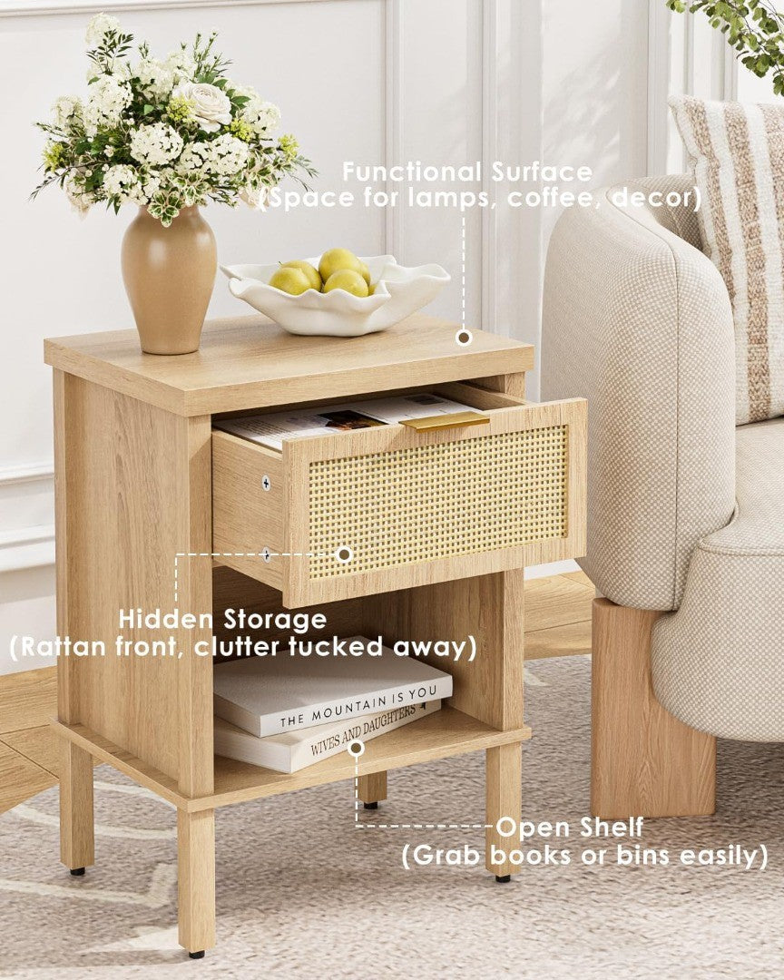 Rattan Bedside Table, Wood Bedside Table Oak, Boho Nightstand with Drawer and Open Shelf, 29x39x61.5cm, for Bedroom, Living Room