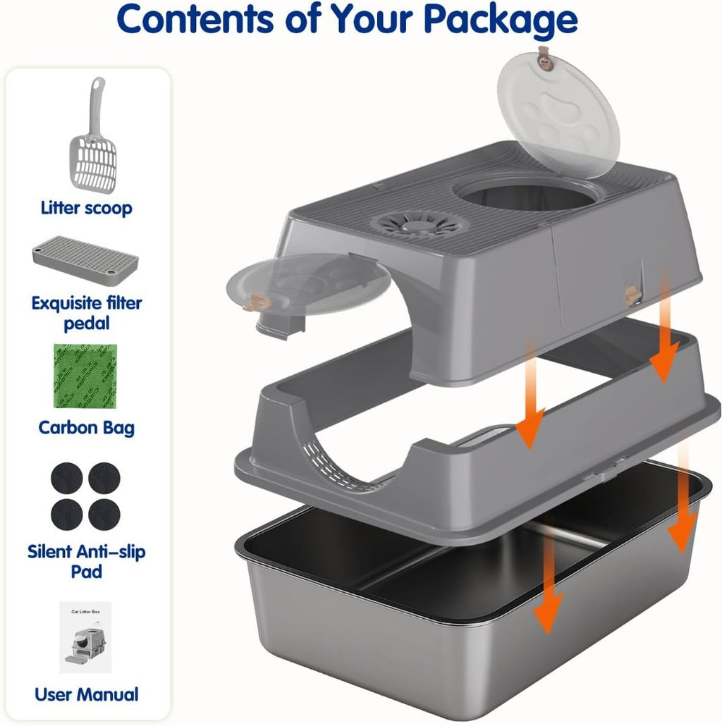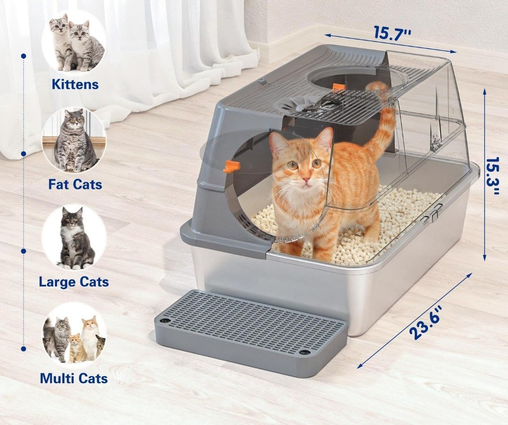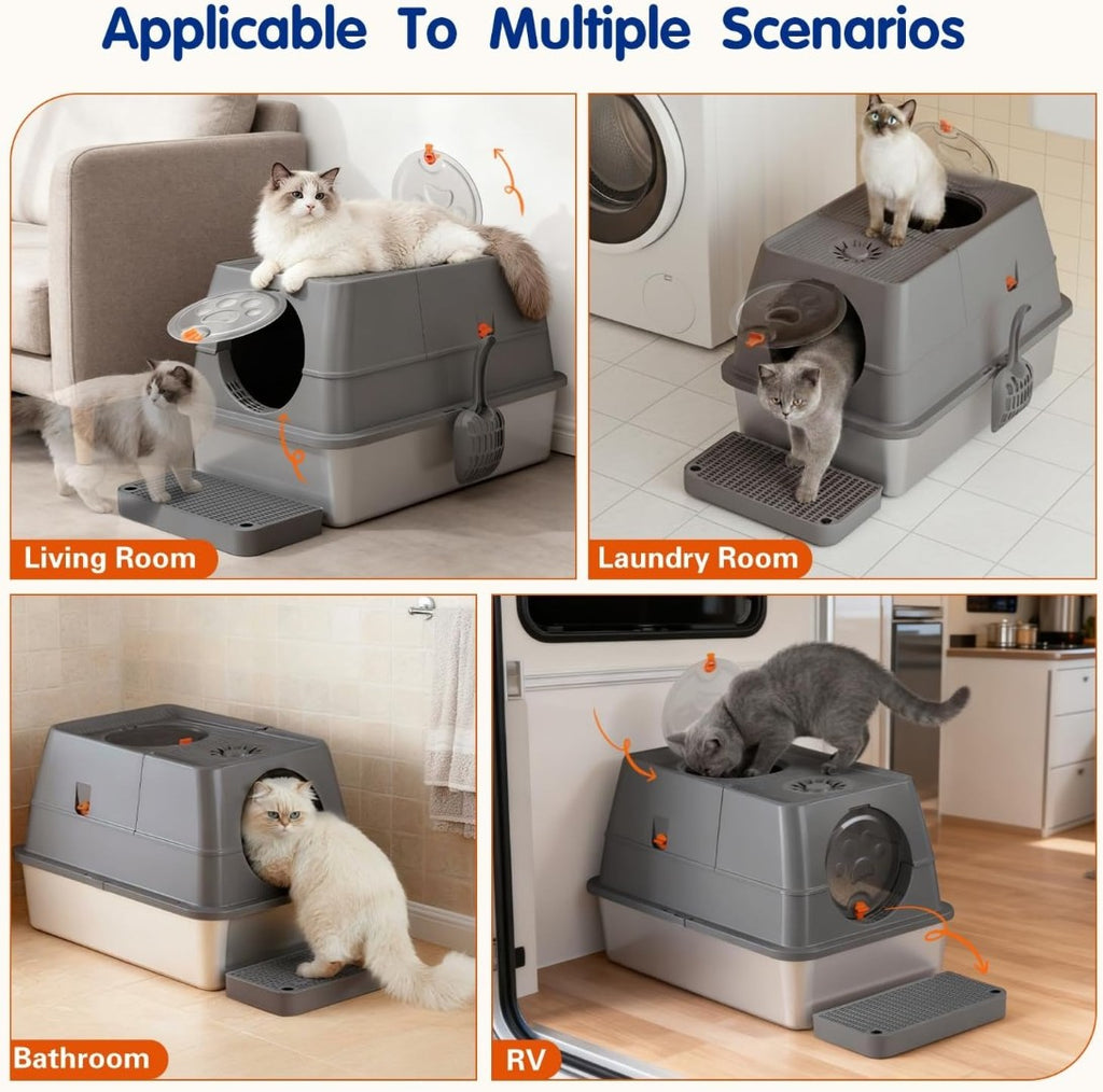 Easy to Clean: The 120-degree flip-top design makes the daily cleaning of the cat litter box even easier and more convenient. You can easily open the door of the cat litter box and clean it with a cat litter scoop without having to remove the entire lid. Thanks to the high-quality stainless steel material, if you need to wash it, simply rinse it with water and wipe it gently. Unlike plastic cat litter boxes, no foreign objects will stick to it.