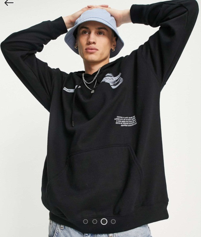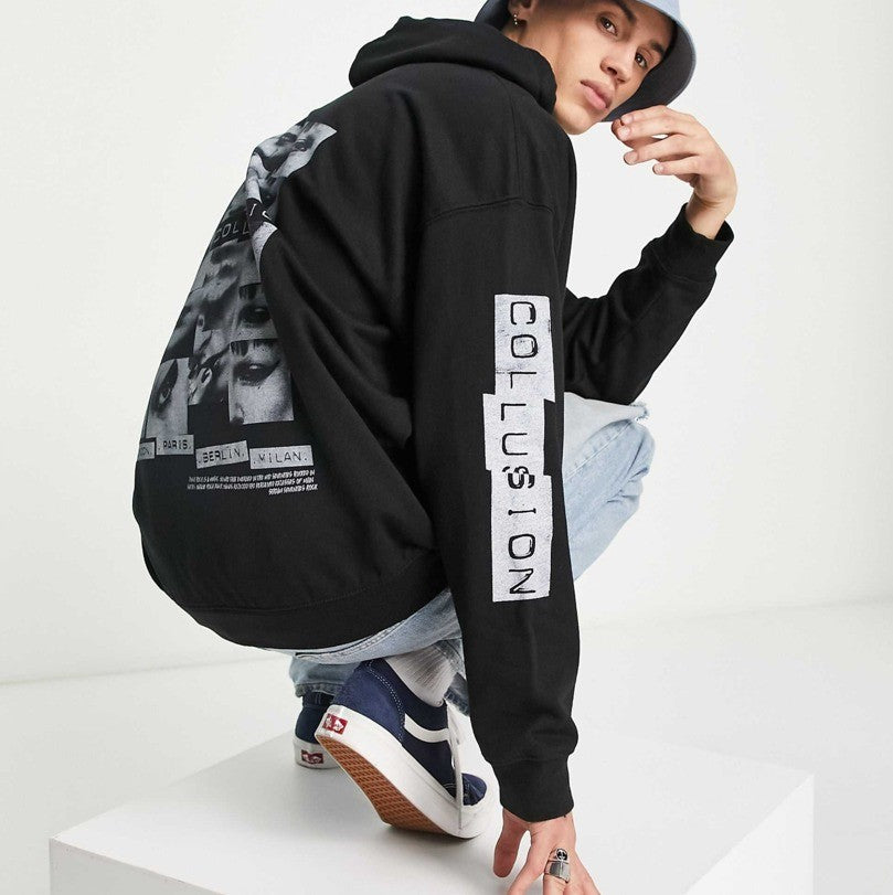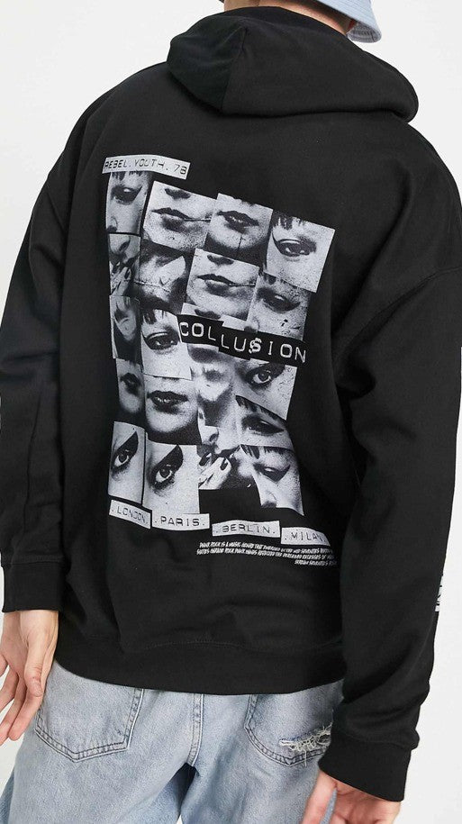 COLLUSION Unisex Hoodie with Poster Style Print Pullover in Black Size S NWT