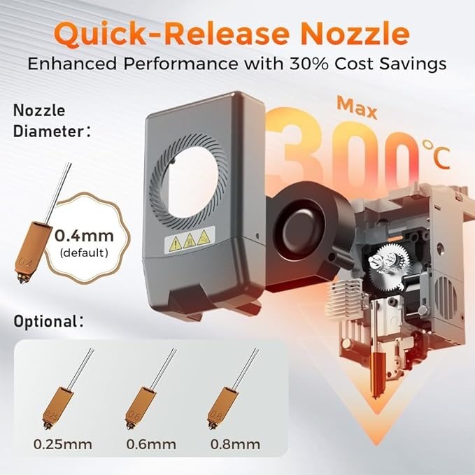 High-Temperature Nozzle (Up to 300°C): The printer’s nozzle can reach temperatures of up to 300°C, making it compatible with a wide range of filaments, including PLA, ABS, PETG, and more.