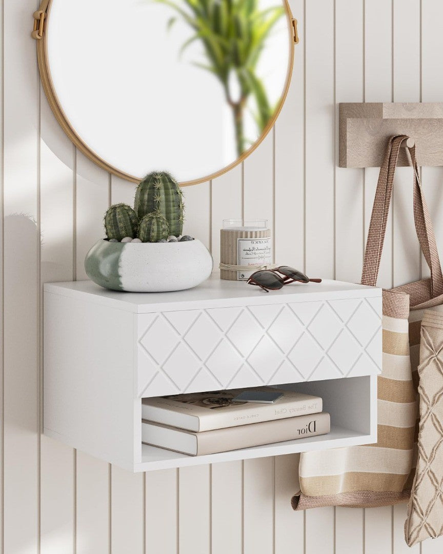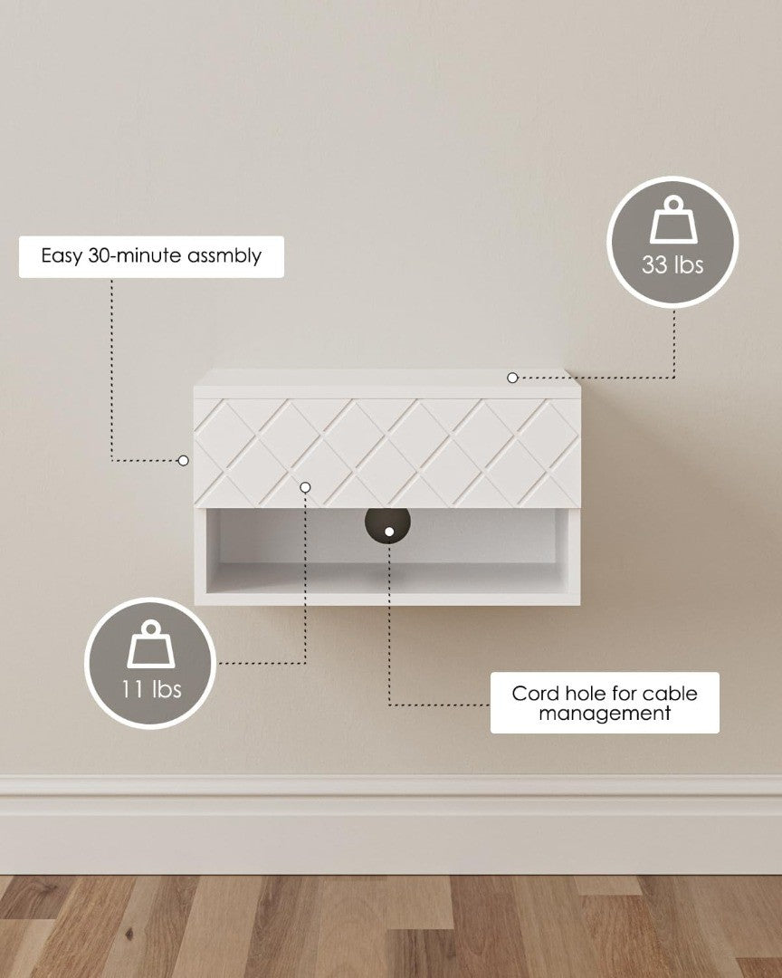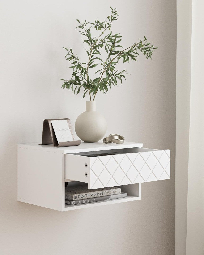 Floating Bedside Table, Small Modern Nightstand With Drawer, Shelves for Bedroom, Bathroom, White Diamond.