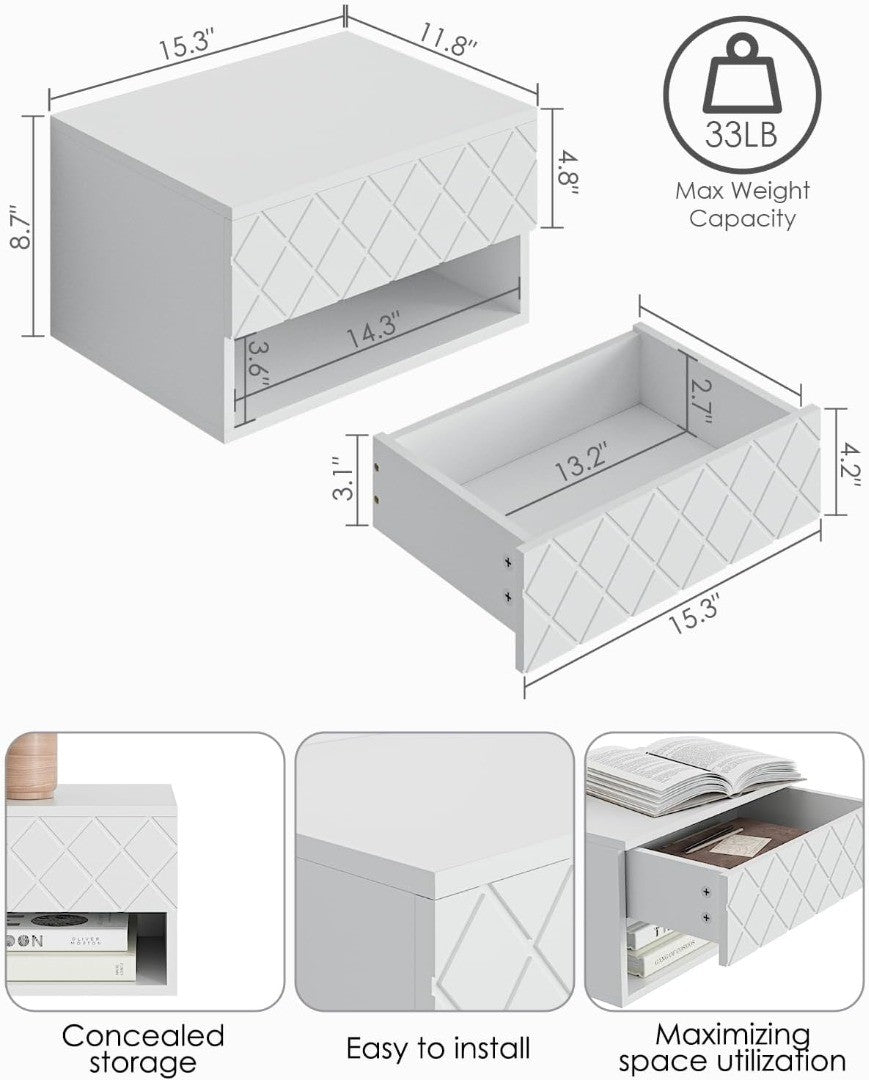 Easy to Assemble: The floating bedside table comes with detailed instructions and all necessary parts in the package. Create the bedroom of your dreams with this wonderfully unique floating drawer shelf. You can easily install this floating night stand, and quickly clean and use. Please feel free to contact us if you have any questions on Nightstand.