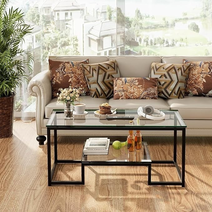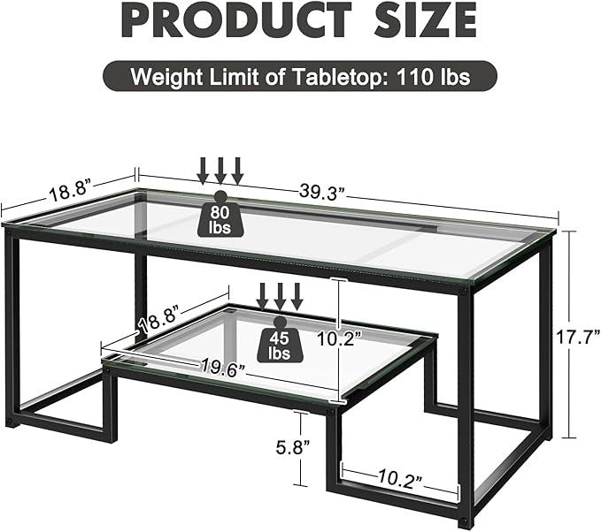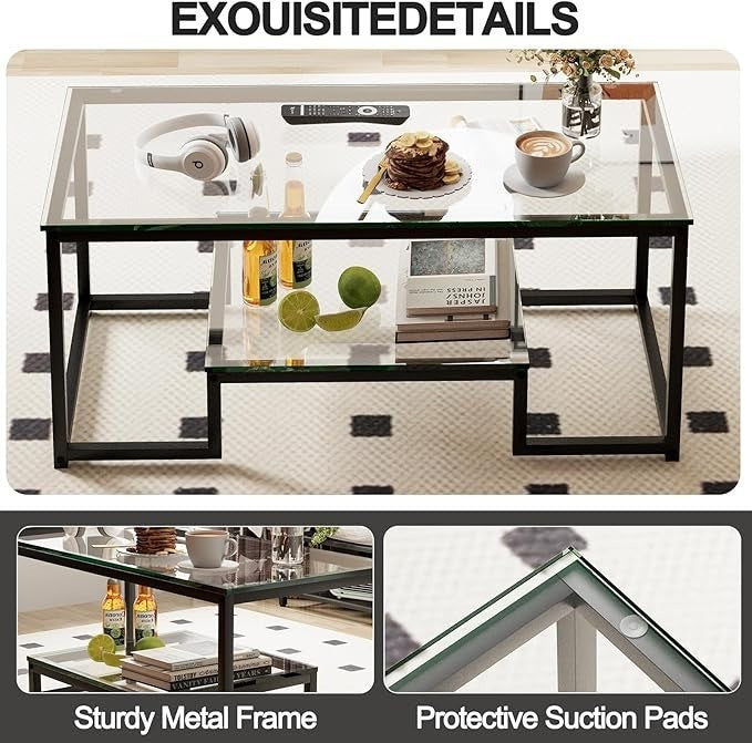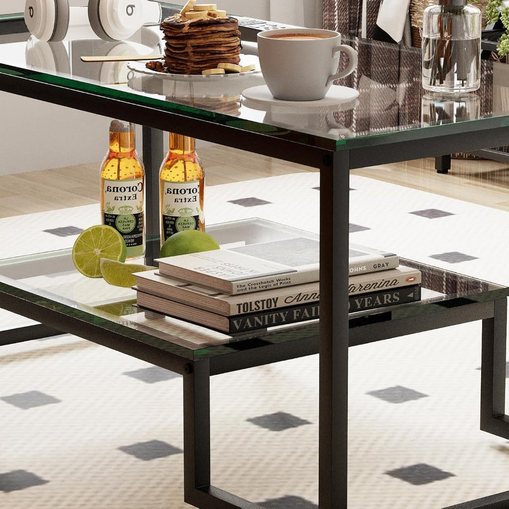 2 Tier Coffee Table, Center Table, Tea Table, Living Room Table with Black Metal Frame, for Living Room Bedroom Office, Modern Open Design, 39.3 x 18.8 x 17.7 IN, Glass