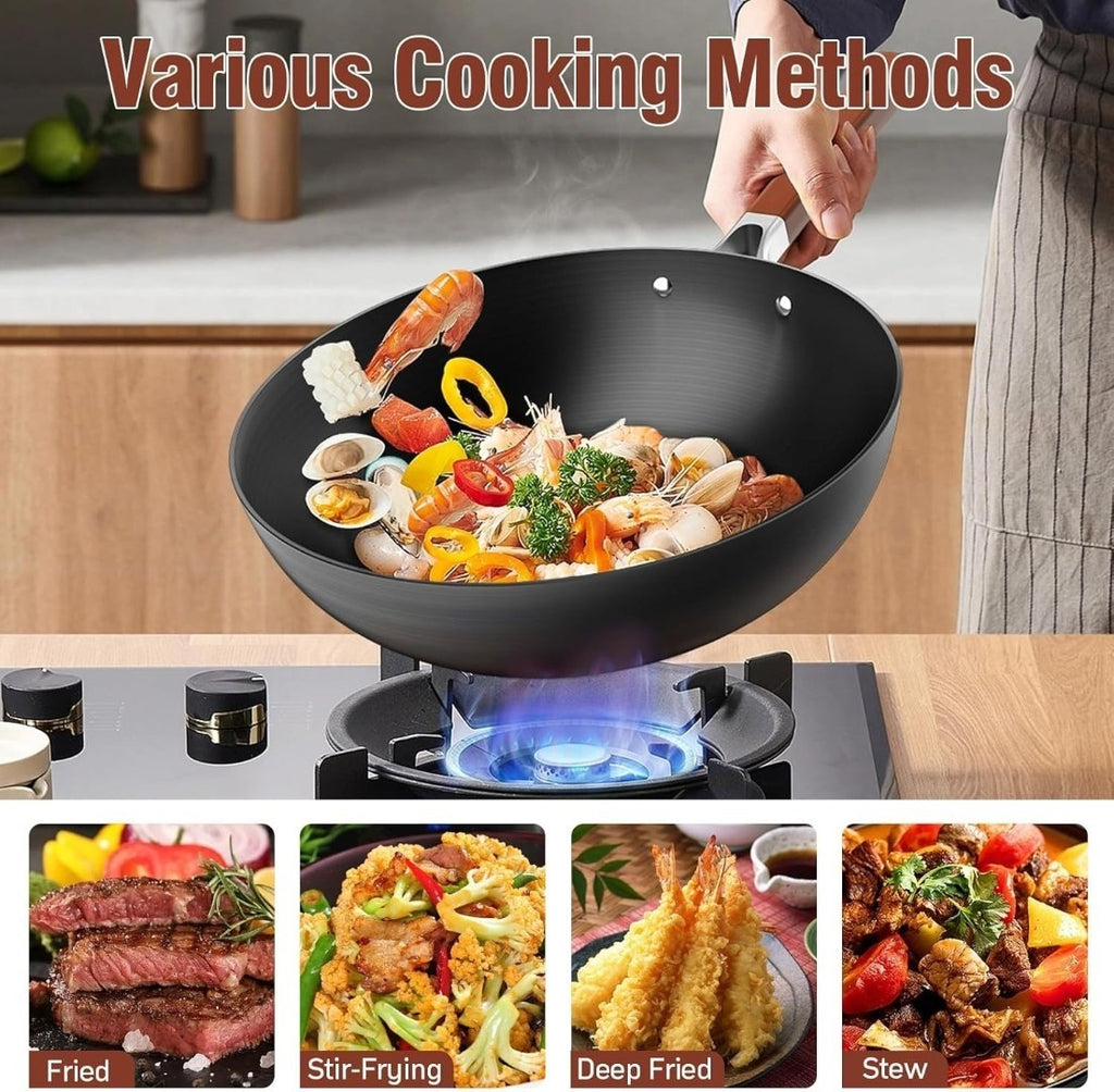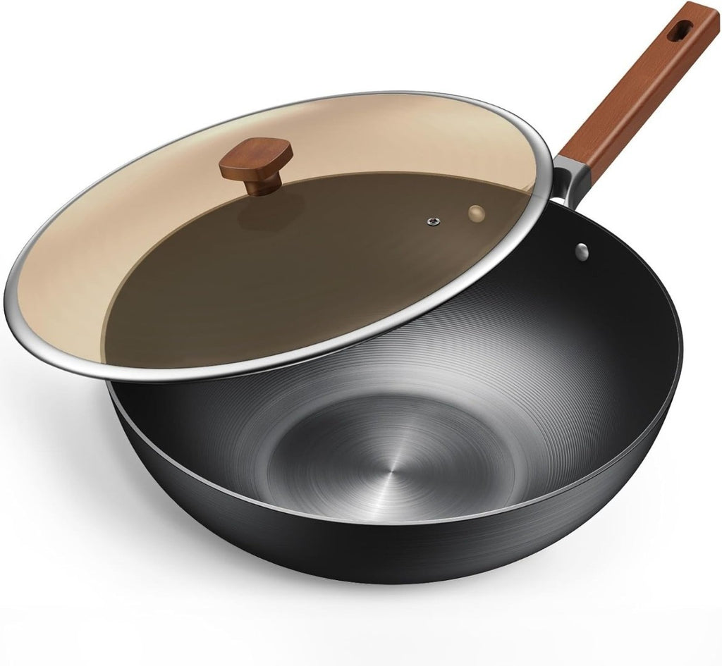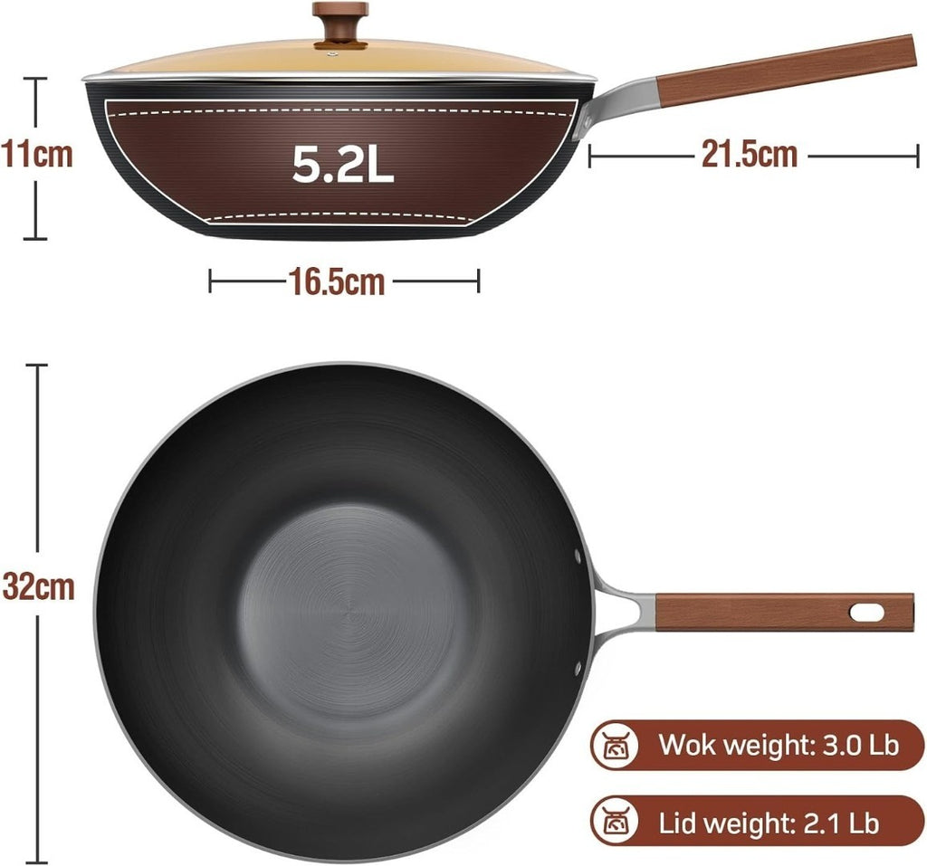 Jobin 32cm/5.2L Wok with Lid Pre-Seasoned Carbon Steel Frying Pan - No Chemical Coated - Large Capacity for Cook Asian Dishes for 4-6 People for Induction, Gas